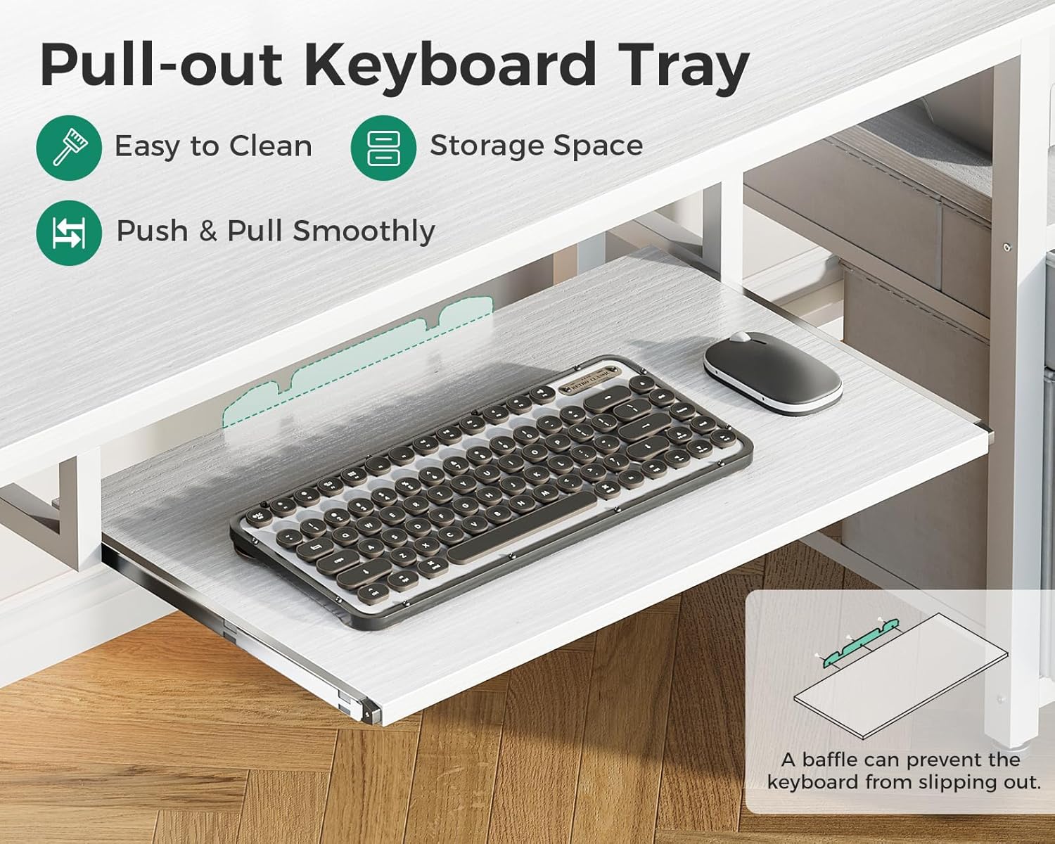 - 【Pull-out Keyboard Tray】The computer desk is equipped with a smoothly sliding pull-out keyboard tray, enhancing your typing comfort. This practical tray accommodates both full-size 108-key keyboards and 87-key keyboards, with ample extra space to fit a mouse alongside