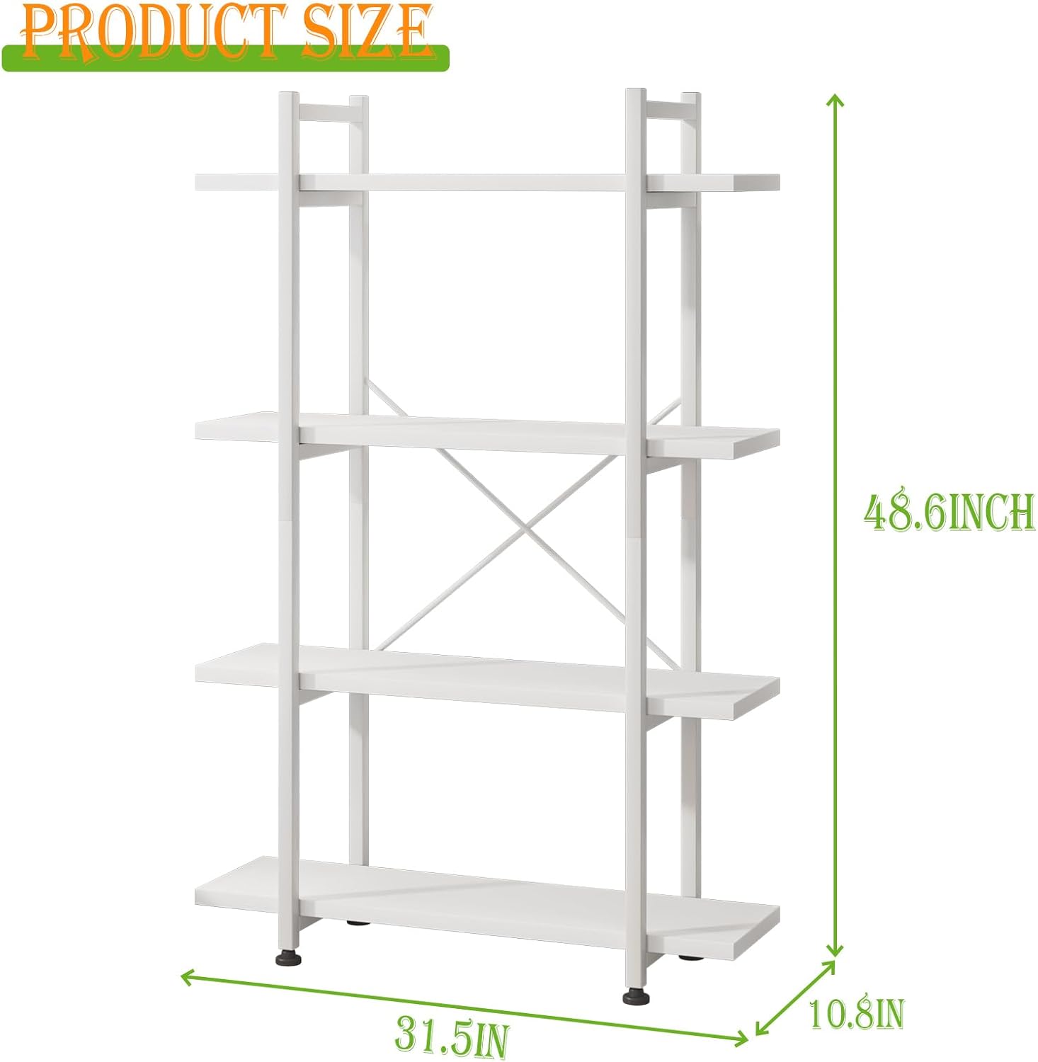 - ✔LARGE CAPACITY The size of this 4 shelf bookcase is 31.5 * 10.8 * 48.4 inches. The height of each shelf is approximately 13 inches. Each shelf can hold 75 pounds. You can store your essentials and decorations with confidence, without worrying about the partition being crushed or toppled.