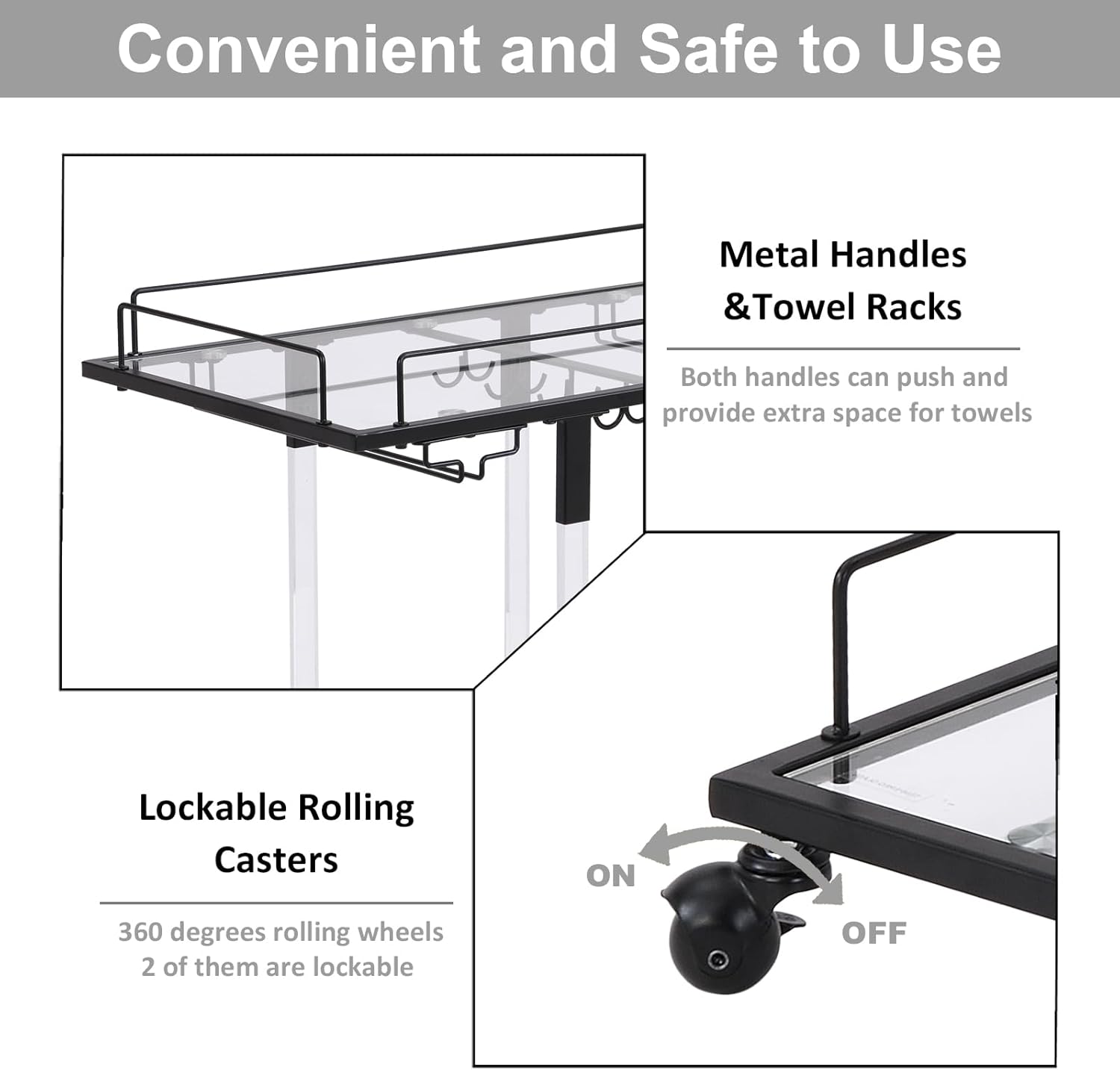 Bar Cart for Home Bar Chrome Serving Cart with Wine Rack 2-Tier Acrylic Rolling Bar Carts on Wheels Clear Dessert Cart Lucite Bar Stand Glass Liquor Cart for Living Room Kitchen Club Black