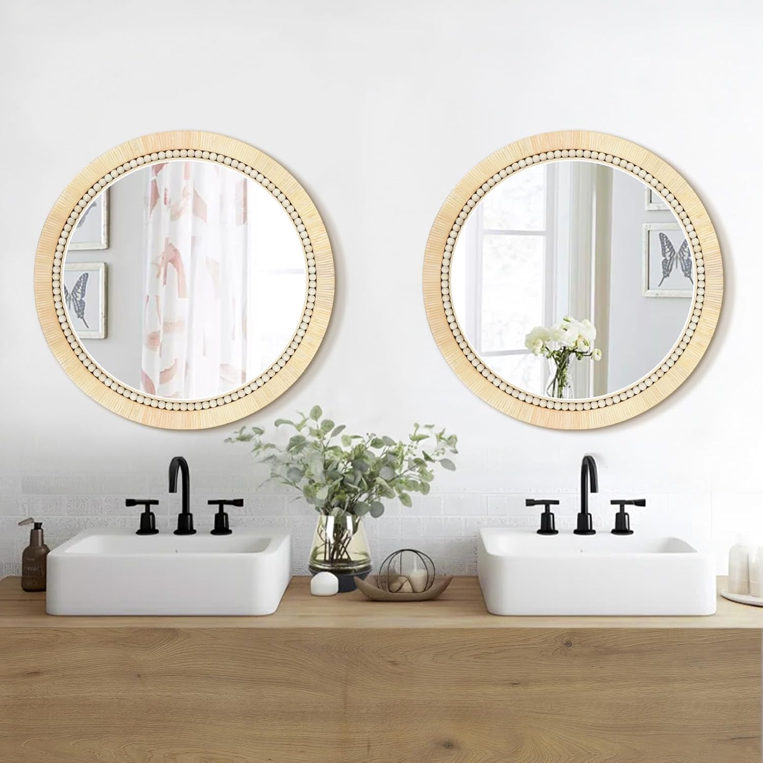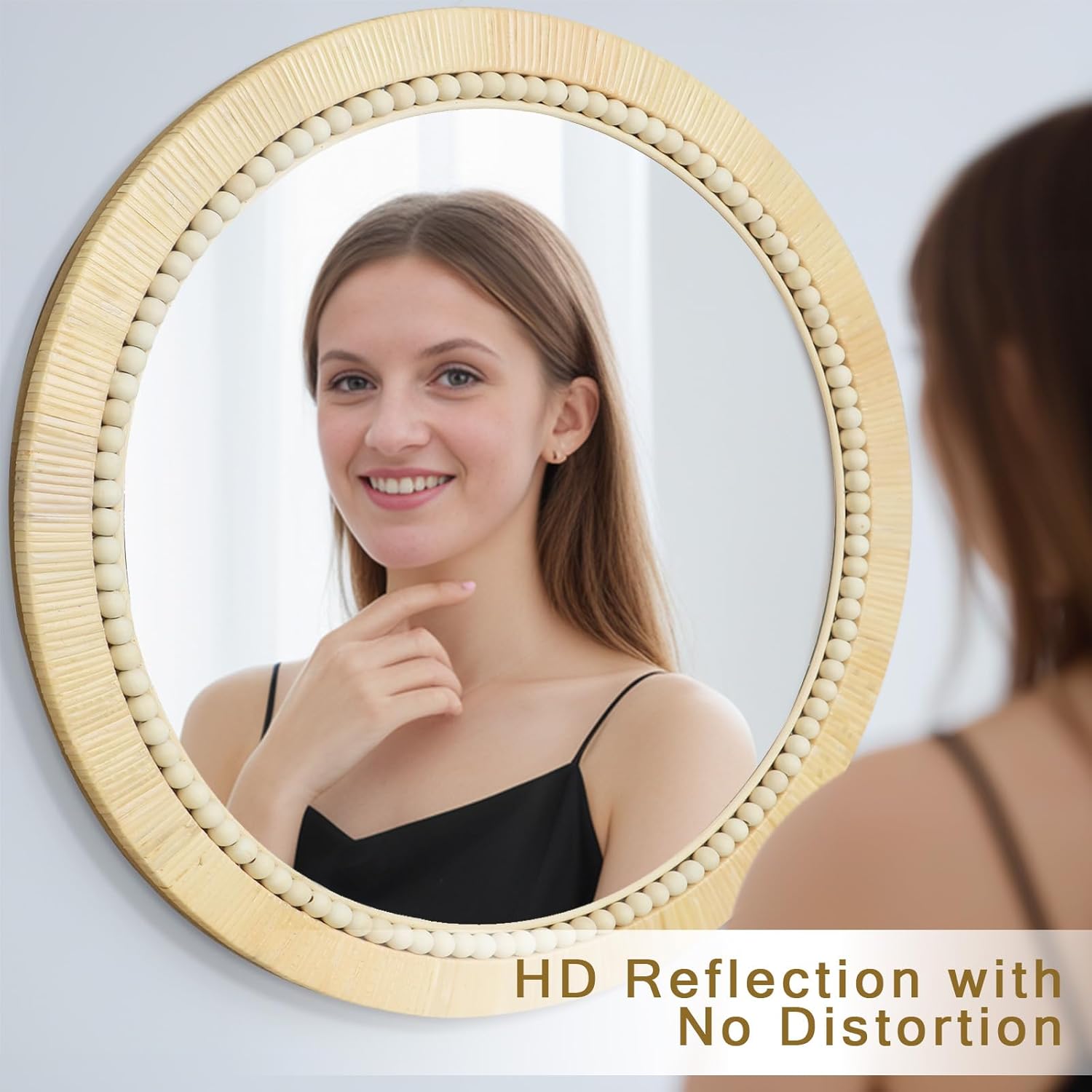 - Pure Handmade Weaving: Our rattan wall mirrors are meticulously crafted by skilled artisans, who carefully select and hand-weave each rattan strip. The weaving is delicate and uniform, with a circle of wooden beads in the center for added decoration