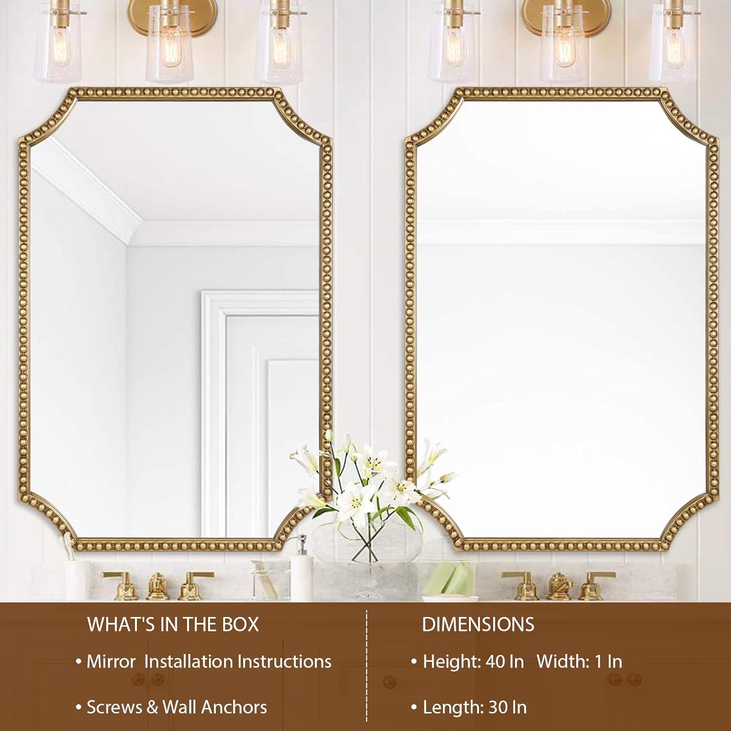 30"x40" Mirror for Wall, Full Scalloped Corners Rectangle Decorative Mirror, Metal Beaded Frame Accent Wall Decor for Bathroom, Entryway, Mantel, Antique Gold