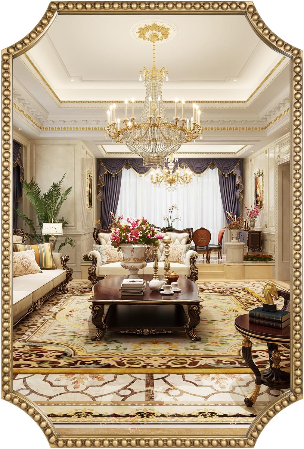 - HD & Explosion-proof - Our artistic luxury gold mirror with scalloped corners adopts to upgraded no-distortion 4MM HD silver glass mirror to deliver clear reflection, simple modern design. Additionally, the explosion-proof film can keep your family safe once the mirror for wall is broken.