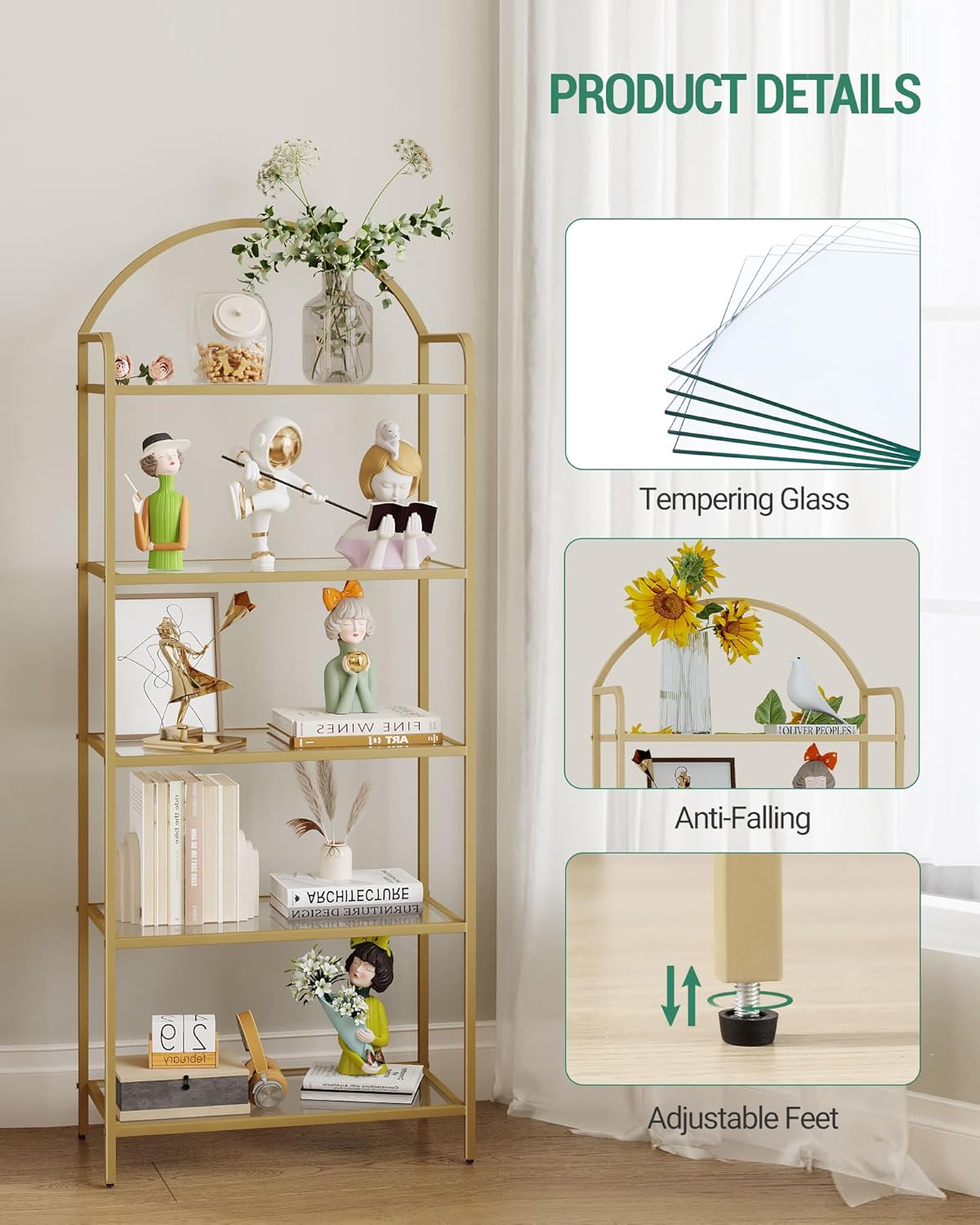 - Decorate Your Room: With transparent tempered glass shelves and a gold-colored frame, this 5-tier storage rack allows you to display your greenery, books, and collectibles while elevating the look of your space. The top oval design makes this bookcase unique and stylish,and helps to decorate your room