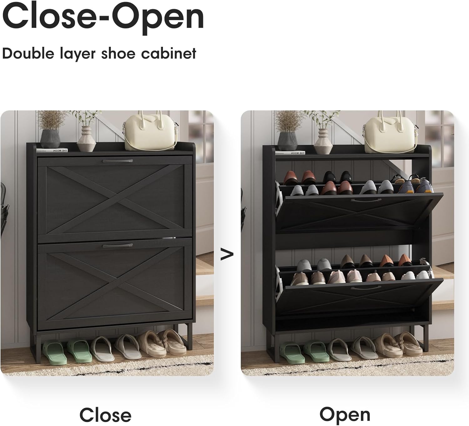 - Entryway Shoe Cabinet: The hidden shoe storage cabinet with 2 flip doors, stylish and simple black makes it a neat and beautiful finish and looks great in many different home styles. Perfect for placing in the entryway, hallway, living room, or porch, provides a neat looking in your home and space saving