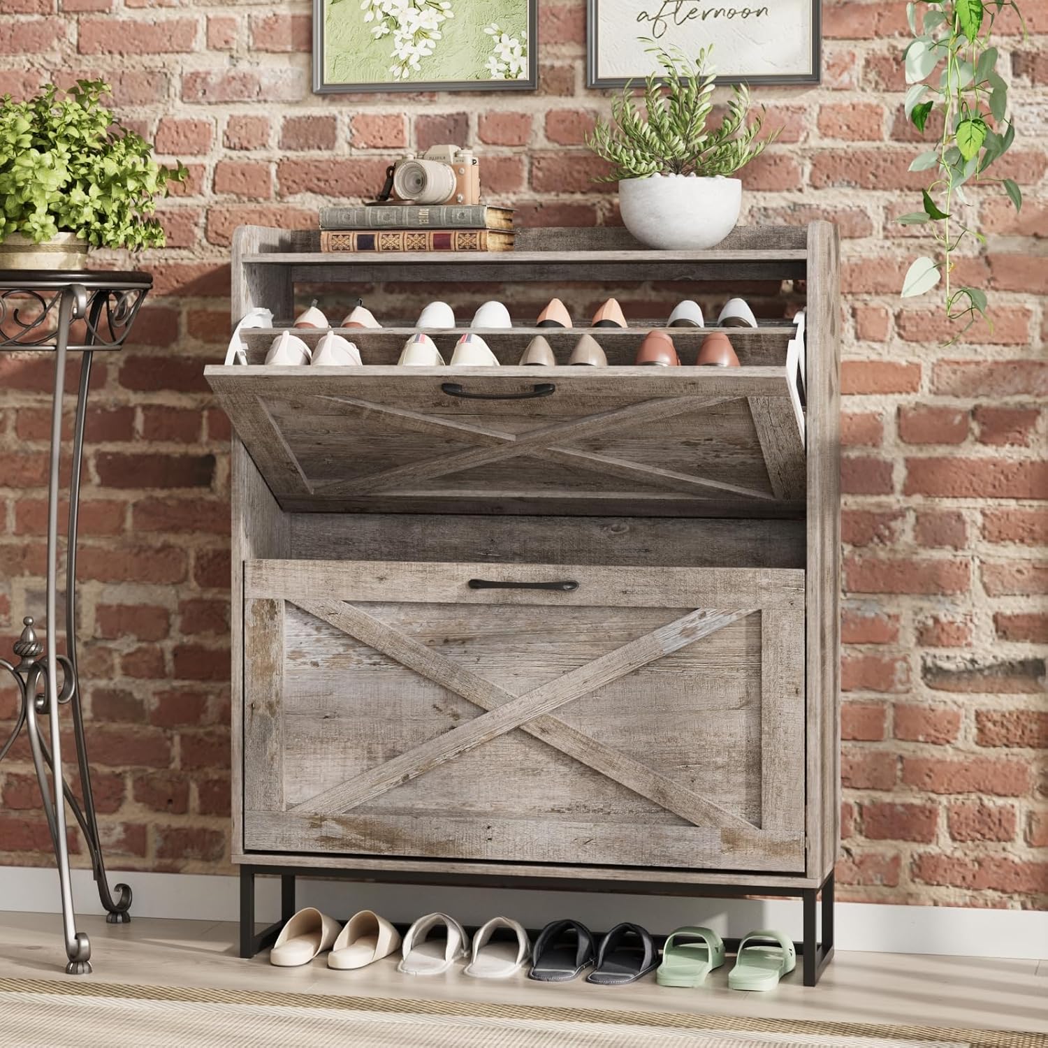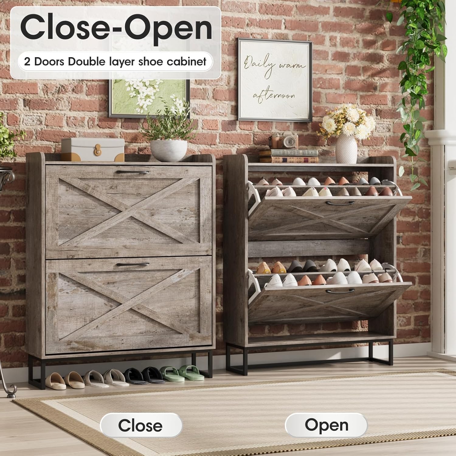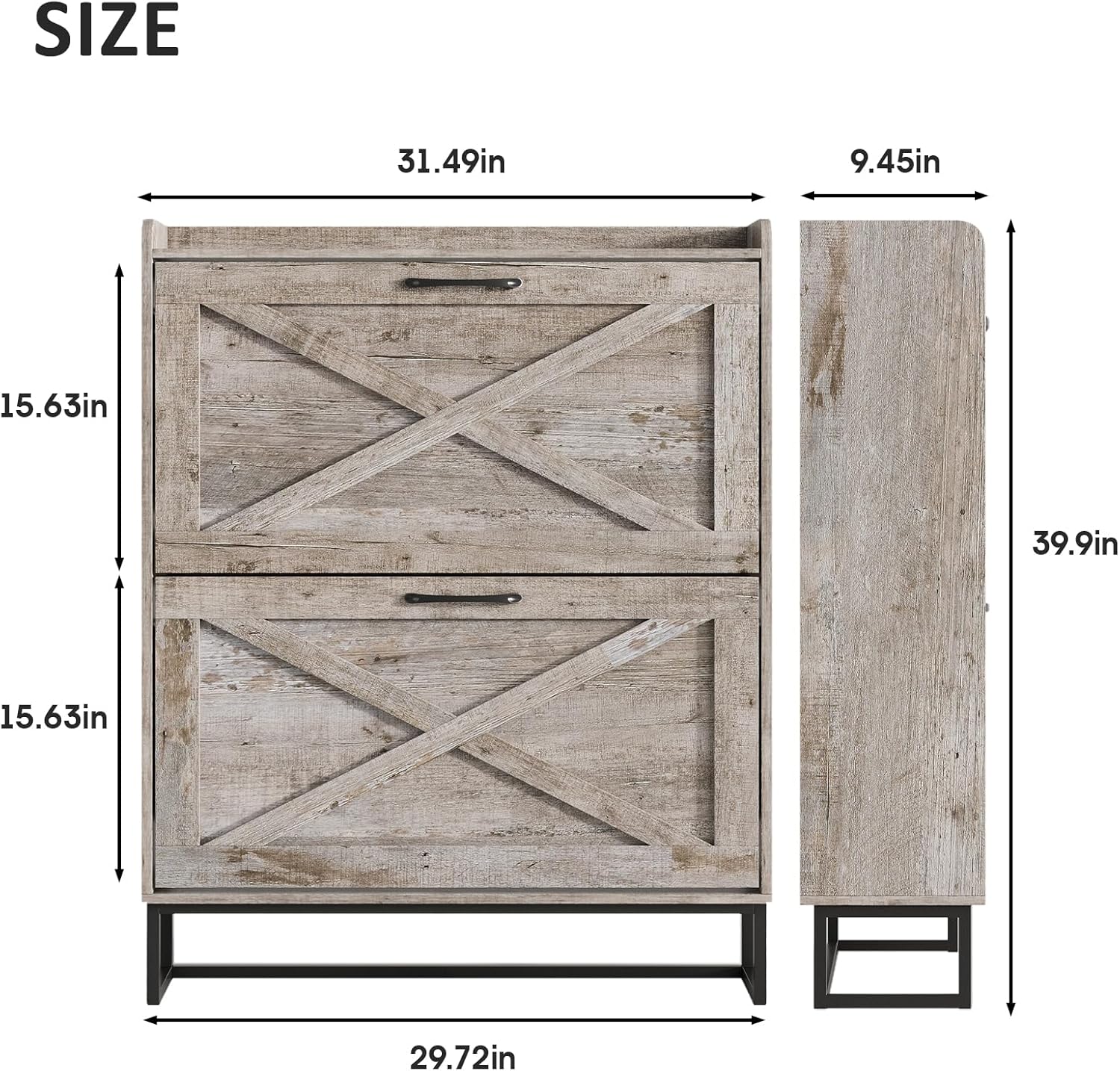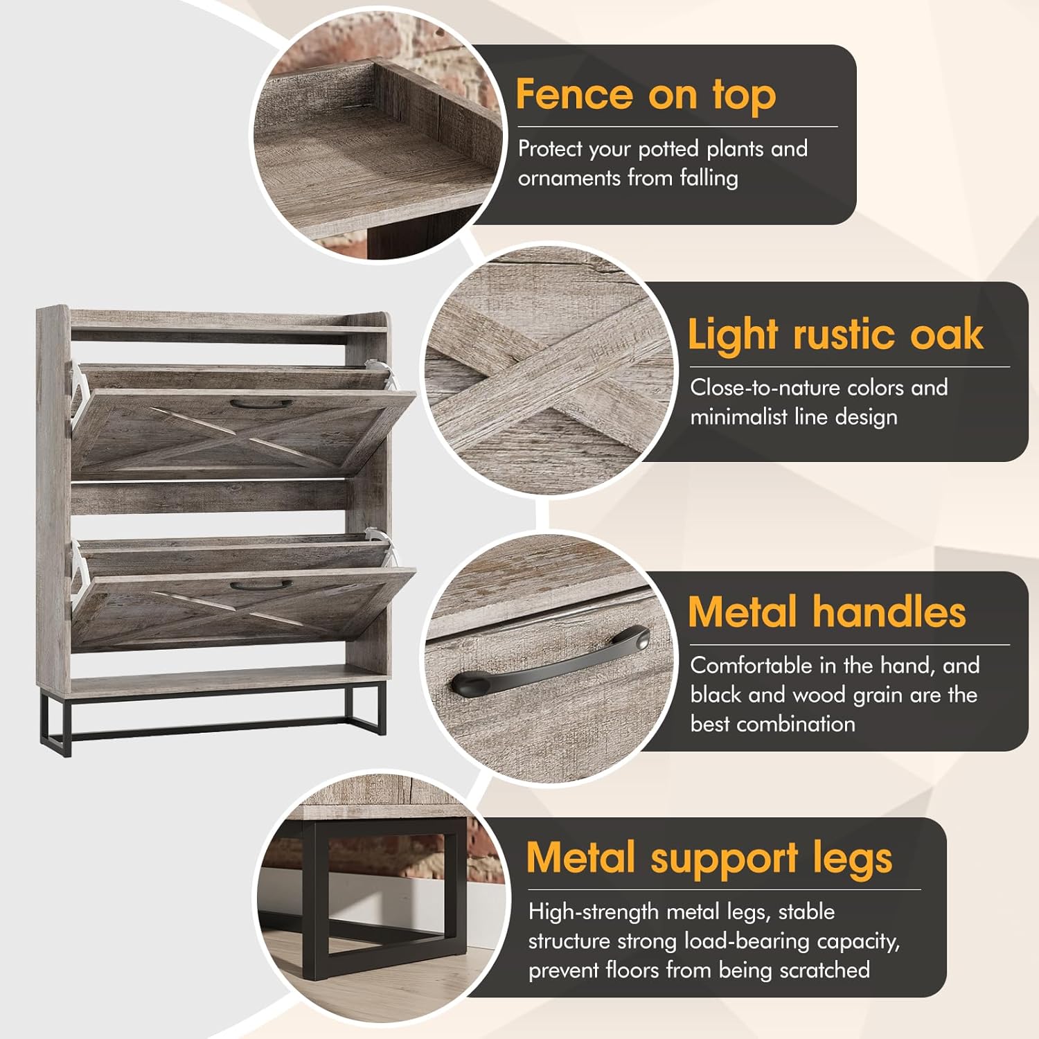 - Entryway Shoe Cabinet: The hidden shoe storage cabinet with 2 flip doors, stylish and simple light rustic oak makes it a neat and beautiful finish and looks great in many different home styles. Perfect for placing in the entryway, hallway, living room, or porch, provides a neat looking in your home and space saving