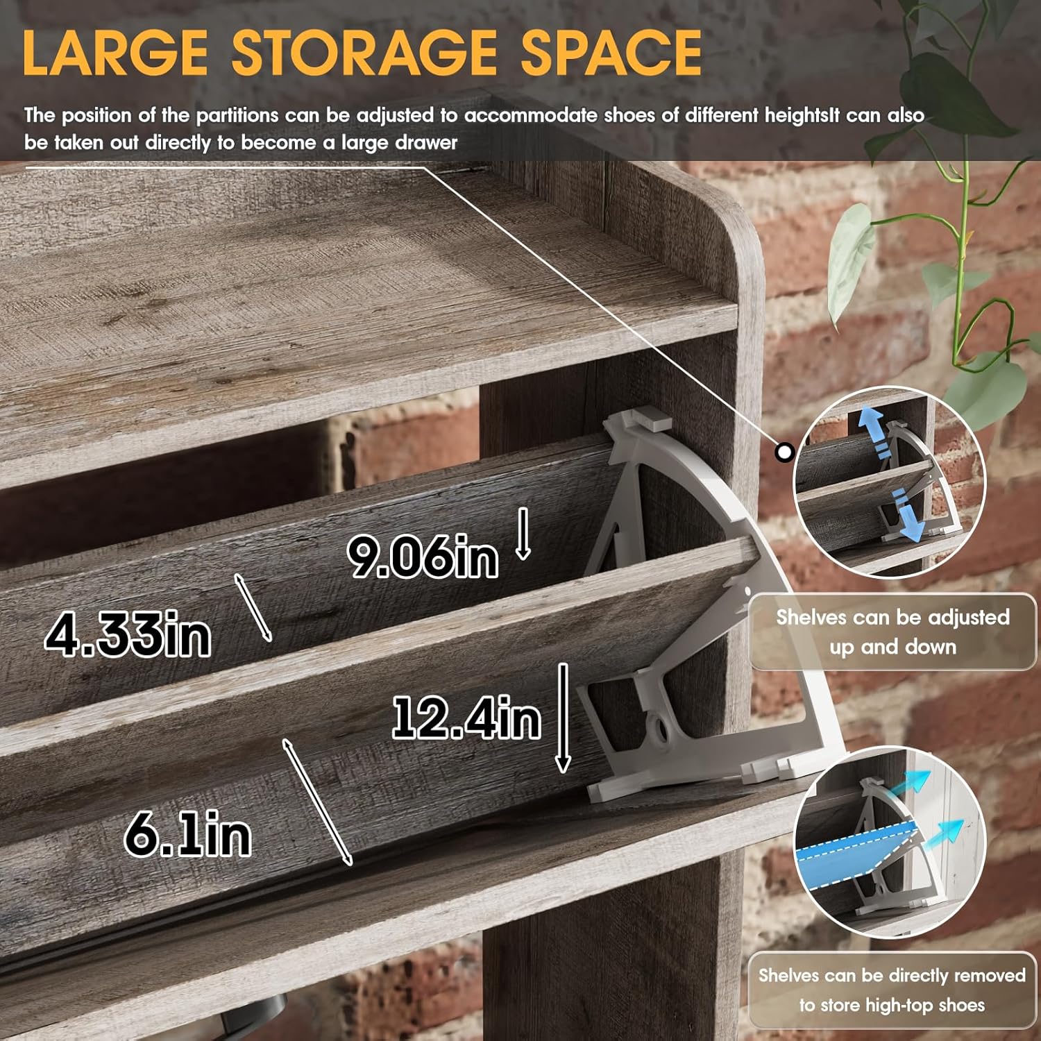 - Flip Drawers Shoe Cabinet: The modern freestanding shoe cabinet adopts the design of space-saving flip drawers, which is easy to open and close. Compared with ordinary shoe racks, this narrow shoe cabinet can be placed in a narrow space, keeping your shoes away from dust and preventing pets from biting your shoes