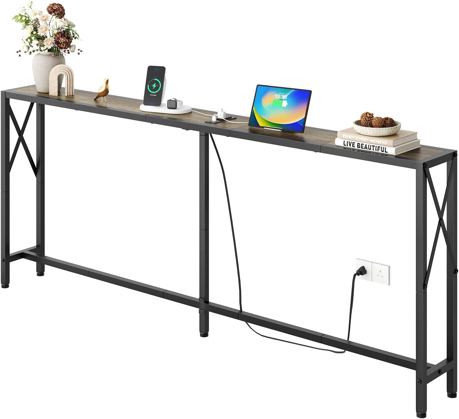70" Sofa Tables Narrow Long, Behind Couch Table with Oulets & USB Ports, Industrial Long Skinny Stand for Entryway,Hallway, Living Room, Bedroom 7.9" D x 70" W x 24.8" H