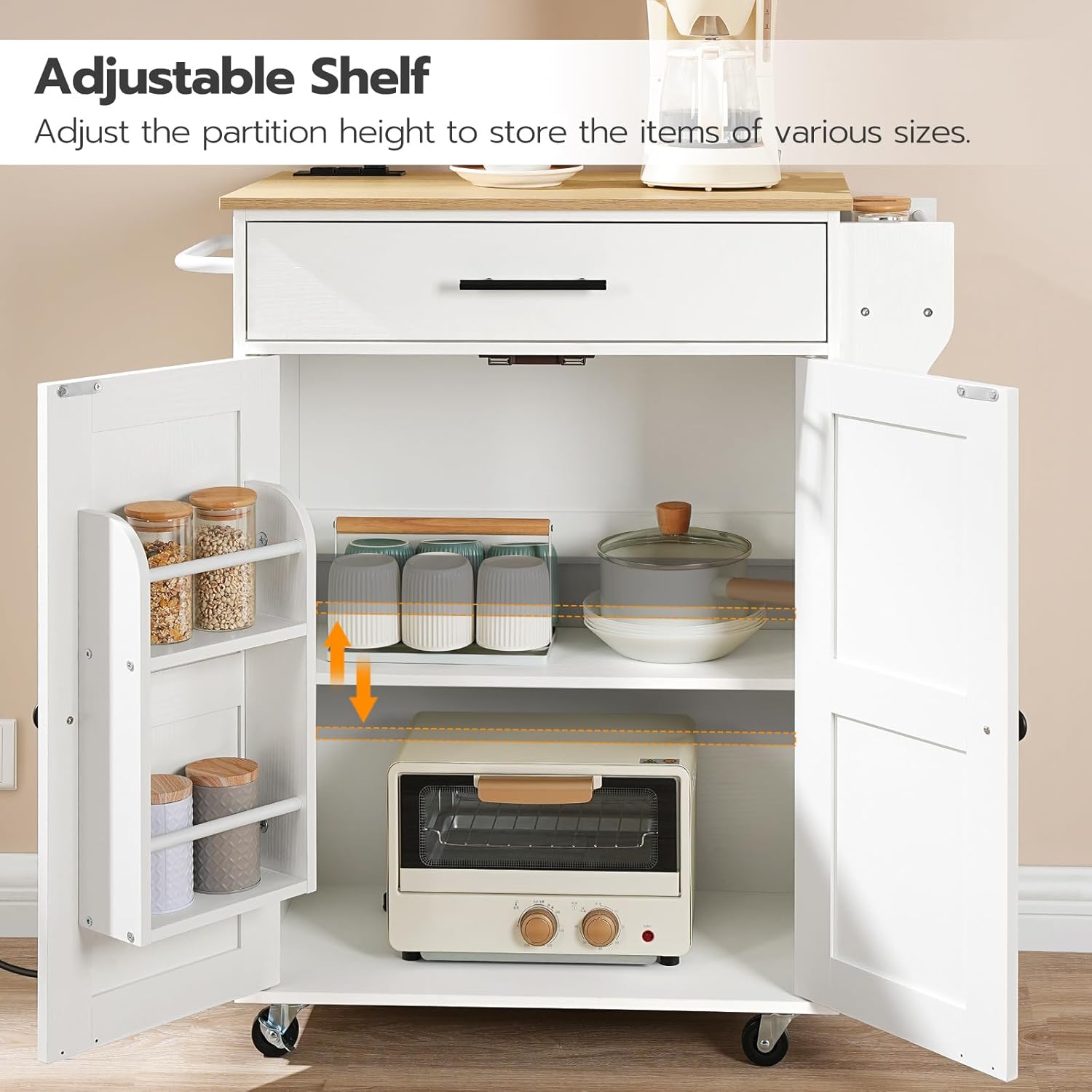 HOOBRO Kitchen Island with Power Outlet, Kitchen Storage Island with Large Worktop, Spice Rack and Drawer, Rolling Island on Wheels, for Dining Room, White and Natural