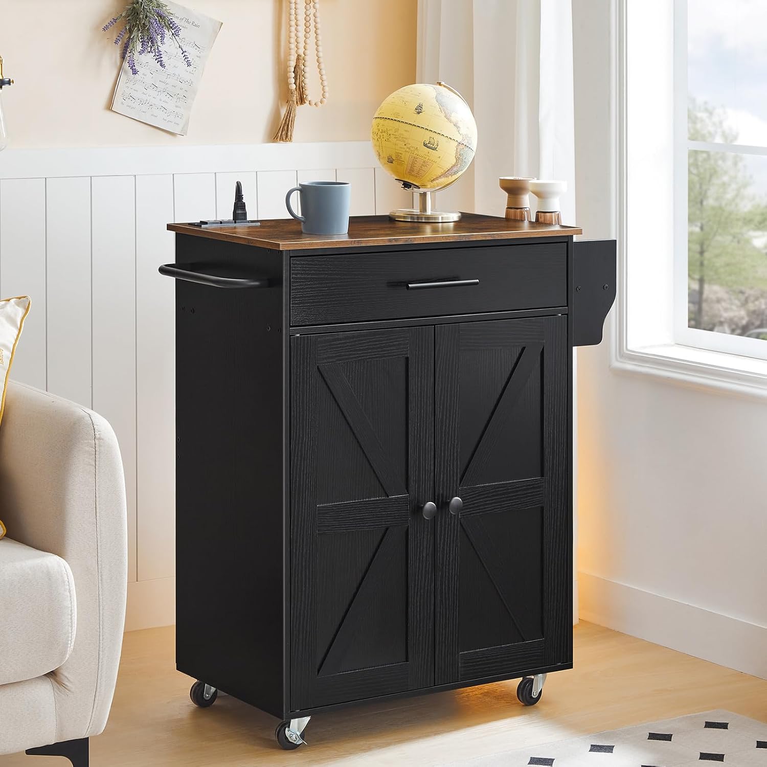 - Retro and Elegant Style: The black cabinet and a rustic brown countertop create a unique aesthetic that highlights the kitchen's warm style. The kitchen island with storage has functional partitions and ample storage space,The mobile island contributes to an exquisite lifestyle, perfect for daily meals.