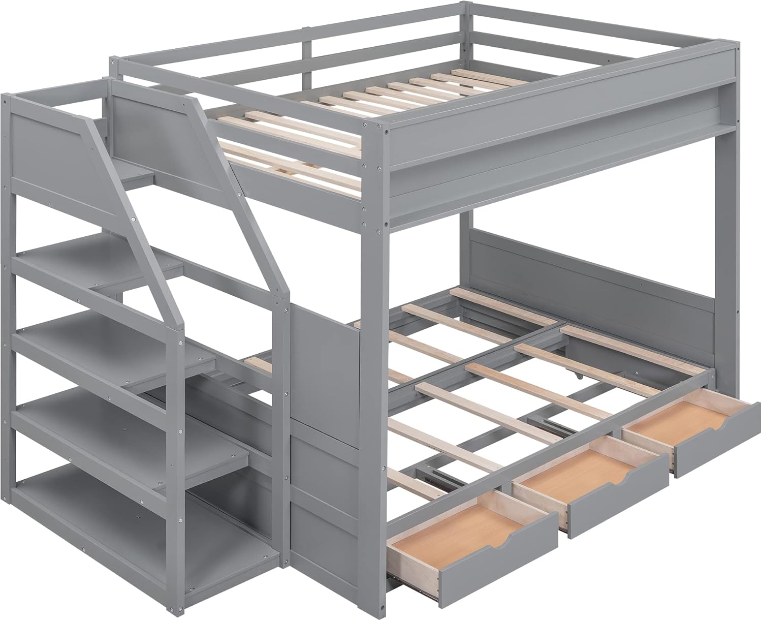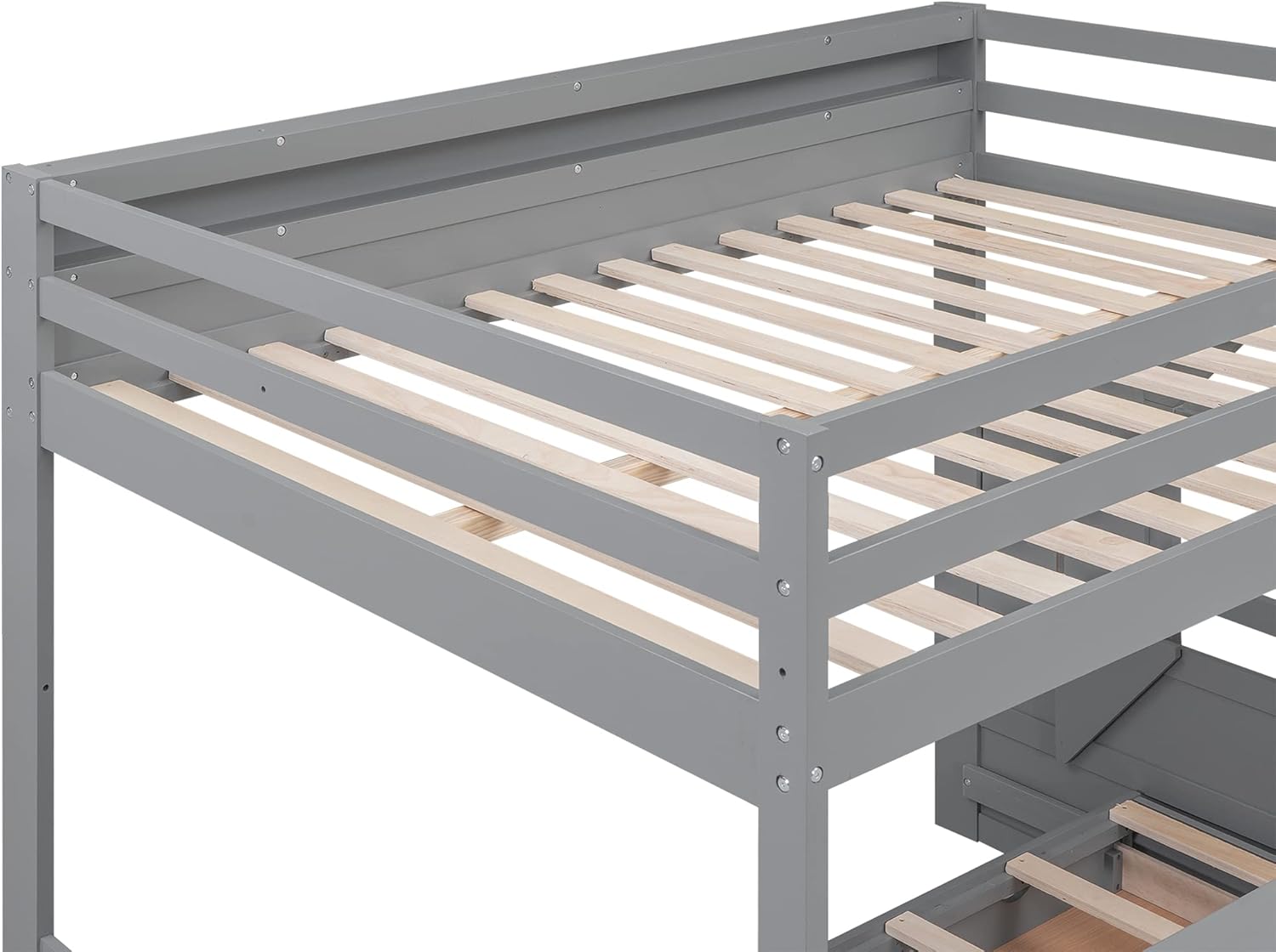 Full Size Wood Bunk Bed with Storage Staircase, Bedside Table, and 3 Drawers,Convertible Down BedFrame,No Box Spring Required,for Kids Boys Girls Teens, Gray
