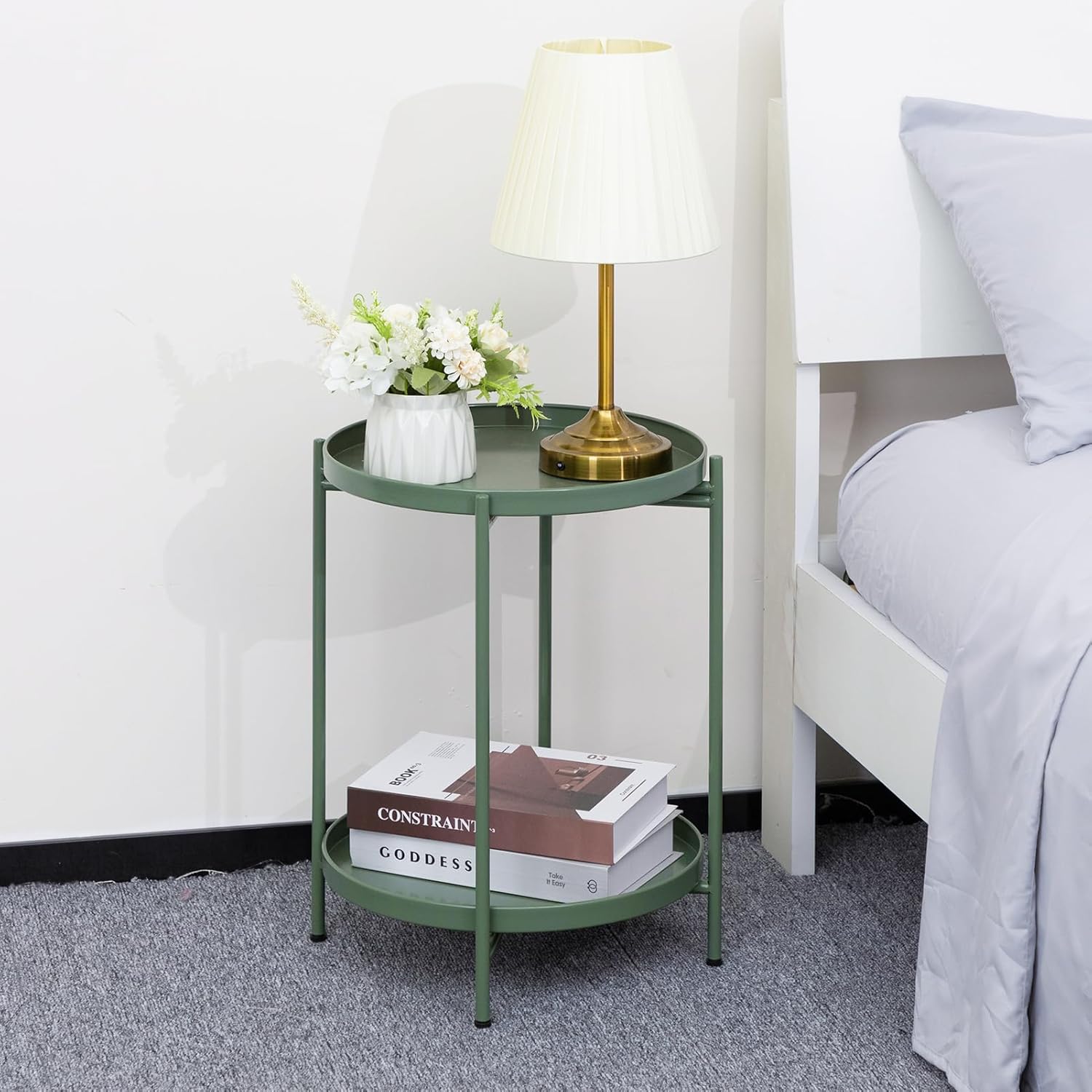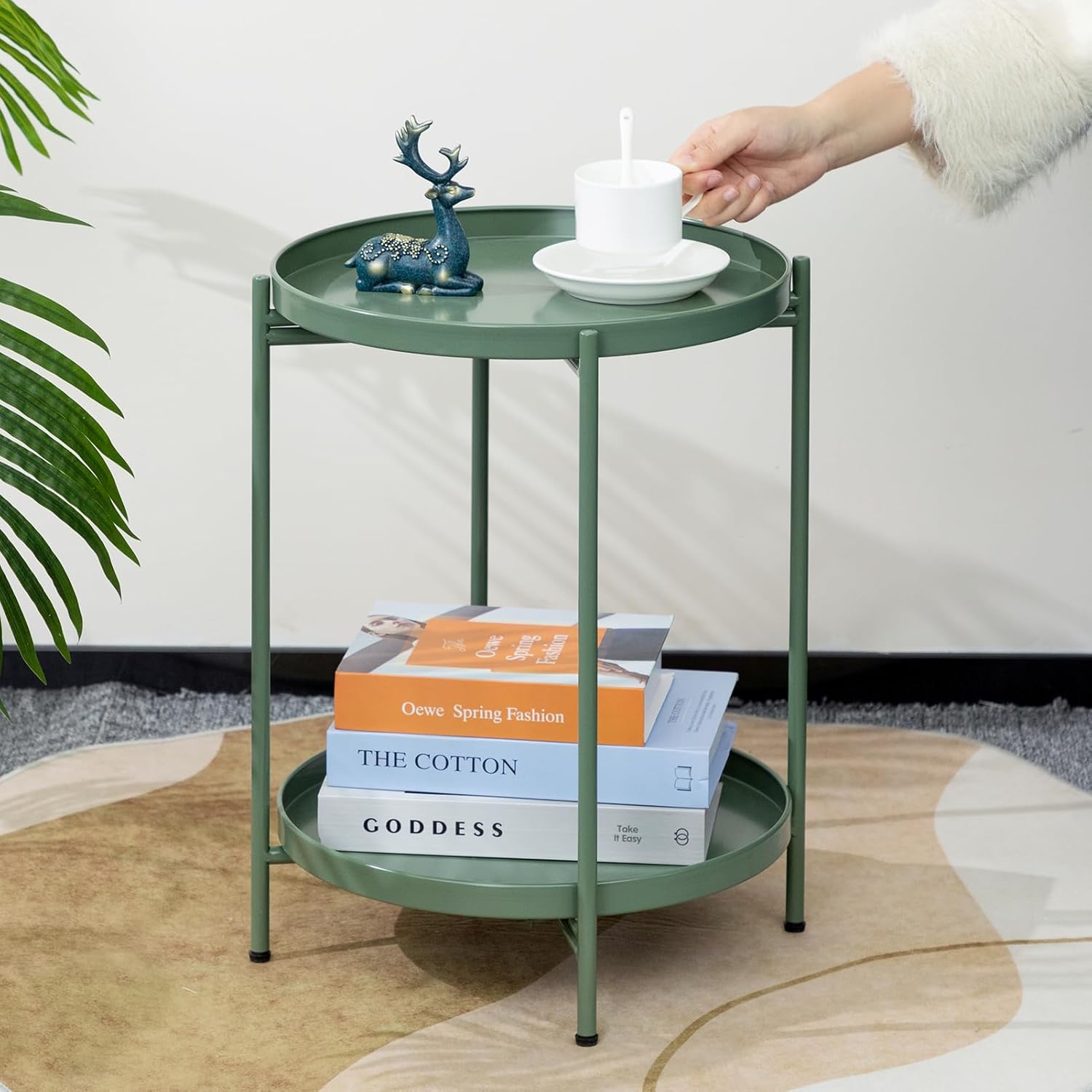 HollyHOME 2-Tier Round Side Table, Outdoor Small Folding Accent Stand with Removable Tray, Anti-Rust Metal Asional Table for Balcony Patio Living Room, Nightstand for Bedroom(Matcha Green)