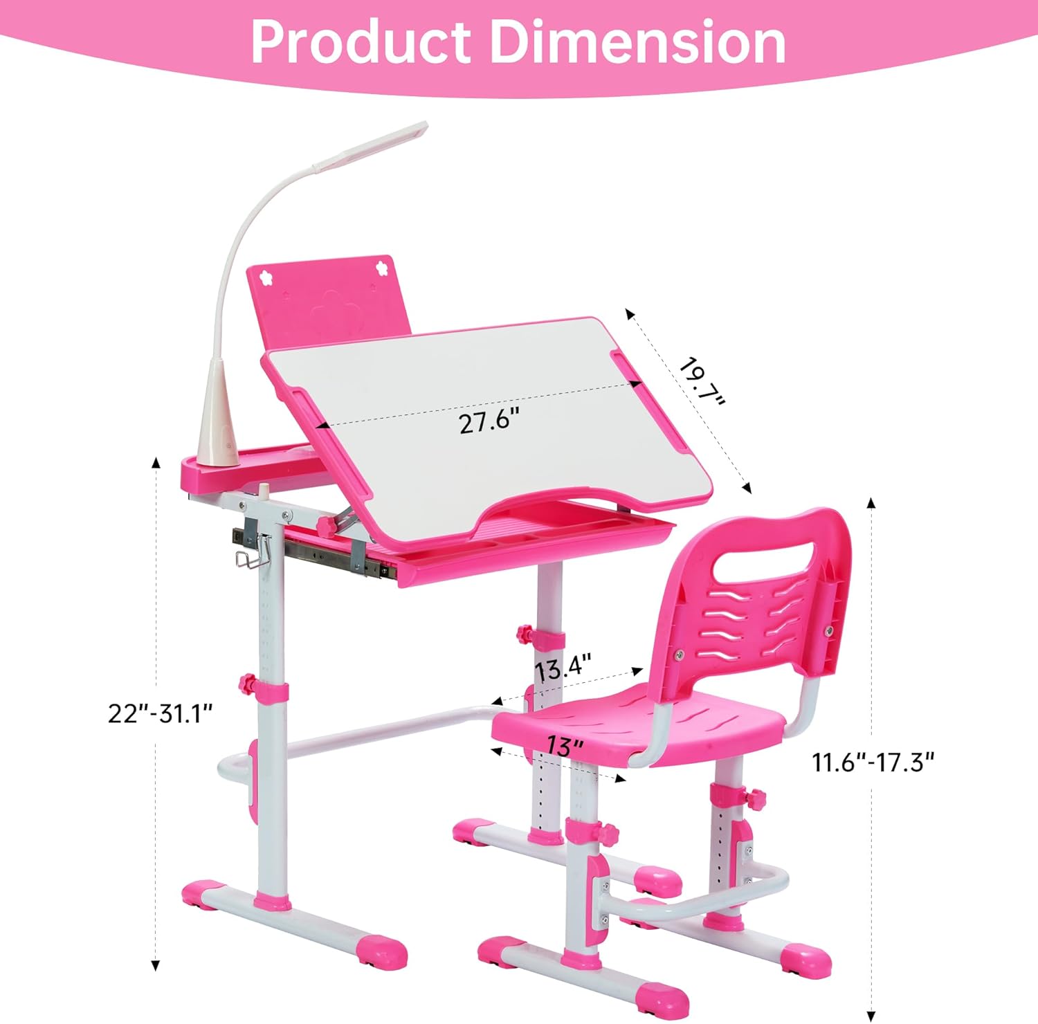 Real Relax Kids Desk and Chair Set, Children's Multifunctional School Tables with Tilt Desktop, LED Light, Metal Hook Pink