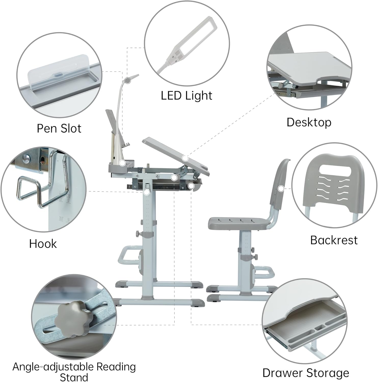Real Relax Kids Desk and Chair Set, Children's Multifunctional School Tables with Tilt Desktop, LED Light, Metal Hook Grey