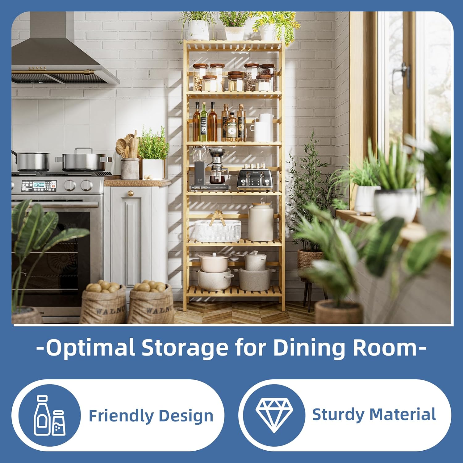 HITNET Bamboo Shelf, 6-Tier Adjustable Tall Open Bookcase, Bathroom Storage Rack Freestanding Shelving Unit, Plant Display Stand for Small Space, Natural