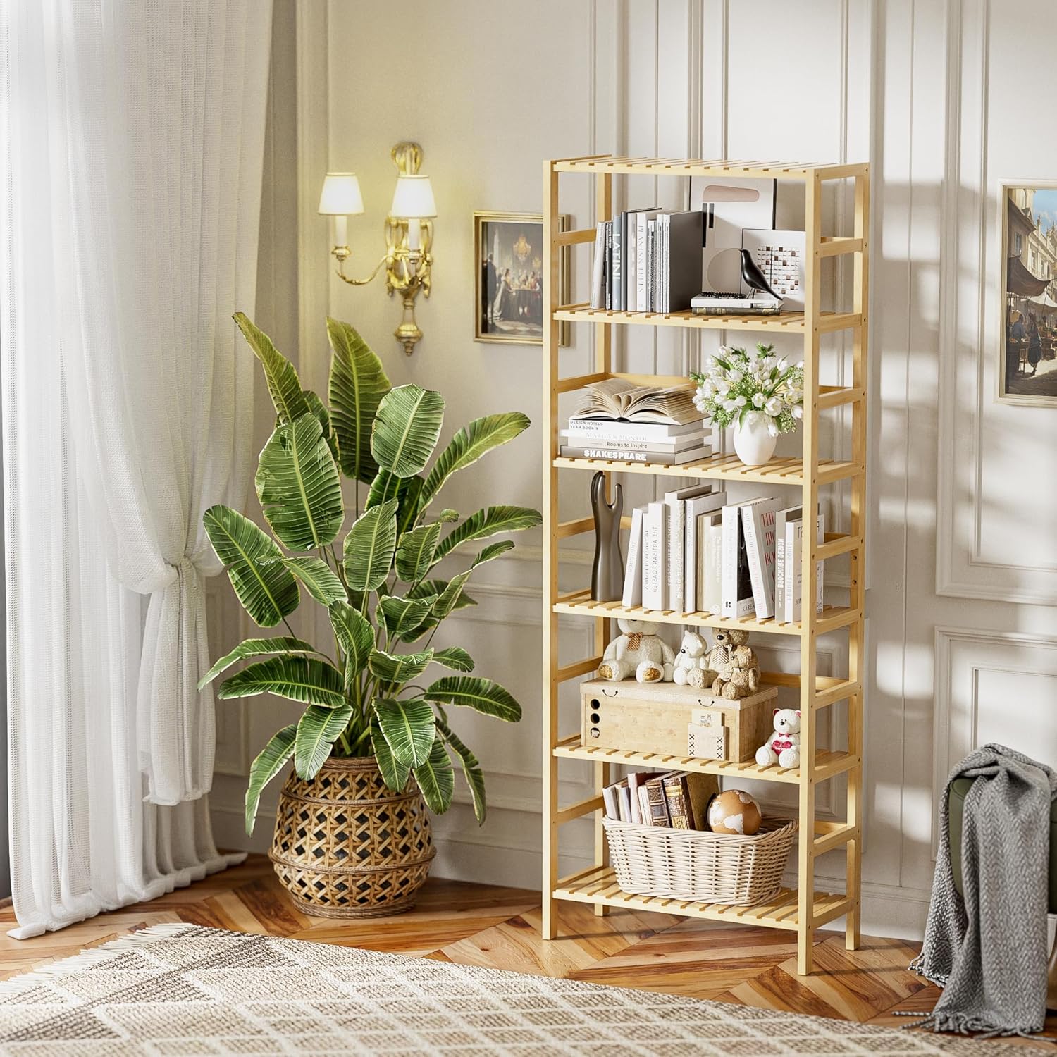 - 6-TIER ADJUSTABLE STANDING OPEN BOOKSHELF - This freestanding 6-tier bamboo shelf provides ample storage space to hold your favorite books, photo albums, crafts, towels, toilet paper or potted plants for your daily essentials and decorative needs. Each shelf has three adjustable heights so you can adjust it up or down to store short or long items to meet your different needs, and the open wide shelves design allows for easy access to your items