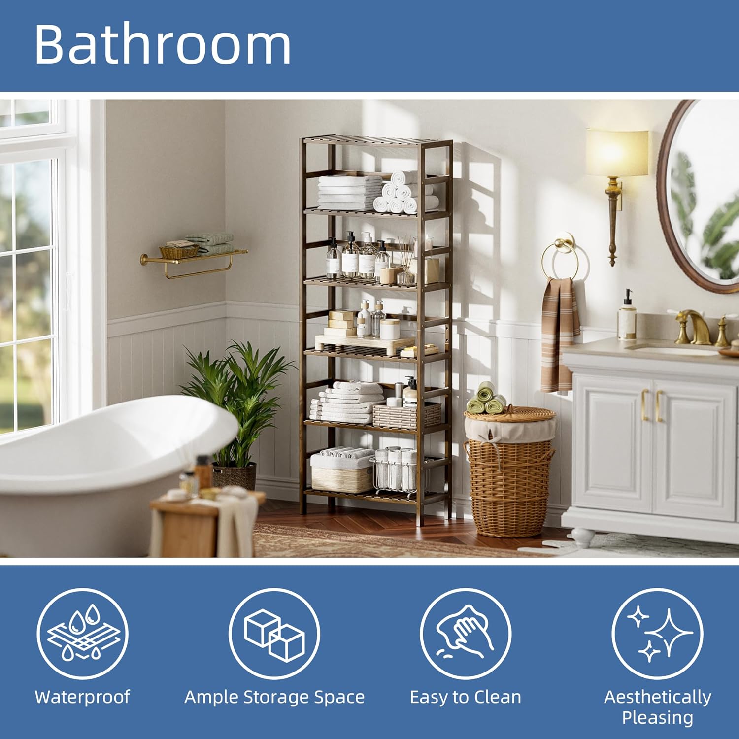 HITNET Bookcase, Bamboo Bookshelf, 6-Tier Adjustable Tall Open Book Shelf, Free Standing Storage Shelves Organizer, Flower Plant Display Stand, Walnut