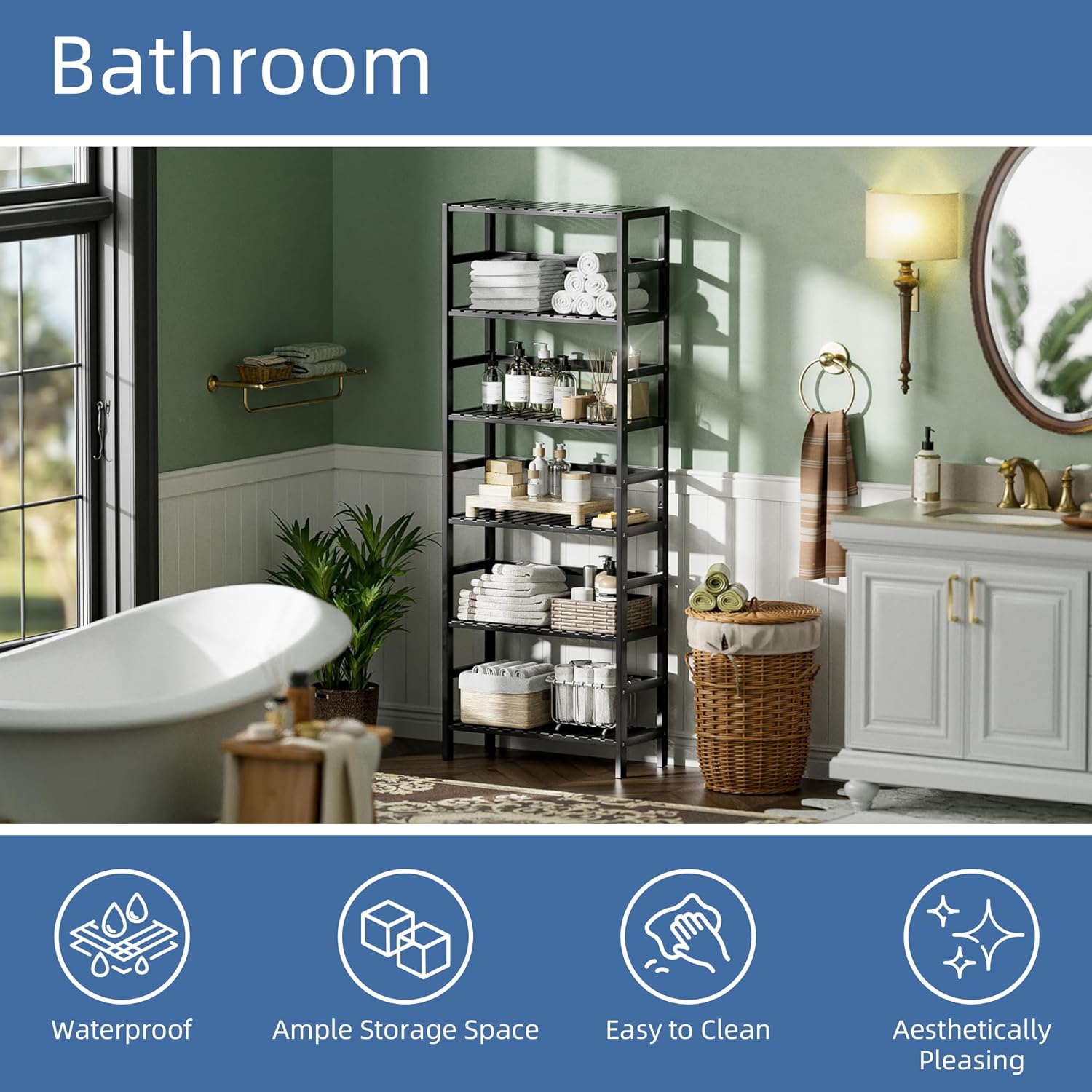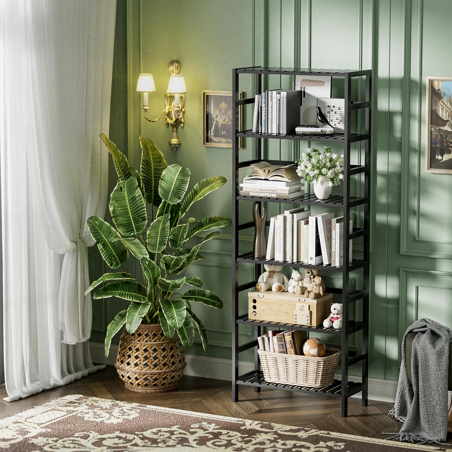 - 6-TIER ADJUSTABLE STANDING OPEN BOOKSHELF - This freestanding 6-tier bamboo shelf provides ample storage space to hold your favorite books, photo albums, crafts, towels, toilet paper or potted plants for your daily essentials and decorative needs. Each shelf has three adjustable heights so you can adjust it up or down to store short or long items to meet your different needs, and the open wide shelves design allows for easy access to your items