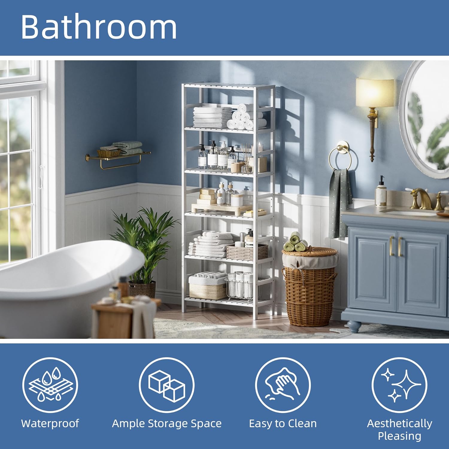 - 6-TIER ADJUSTABLE STANDING OPEN BOOKSHELF - This freestanding 6-tier bamboo shelf provides ample storage space to hold your favorite books, photo albums, crafts, towels, toilet paper or potted plants for your daily essentials and decorative needs. Each shelf has three adjustable heights so you can adjust it up or down to store short or long items to meet your different needs, and the open wide shelves design allows for easy access to your items