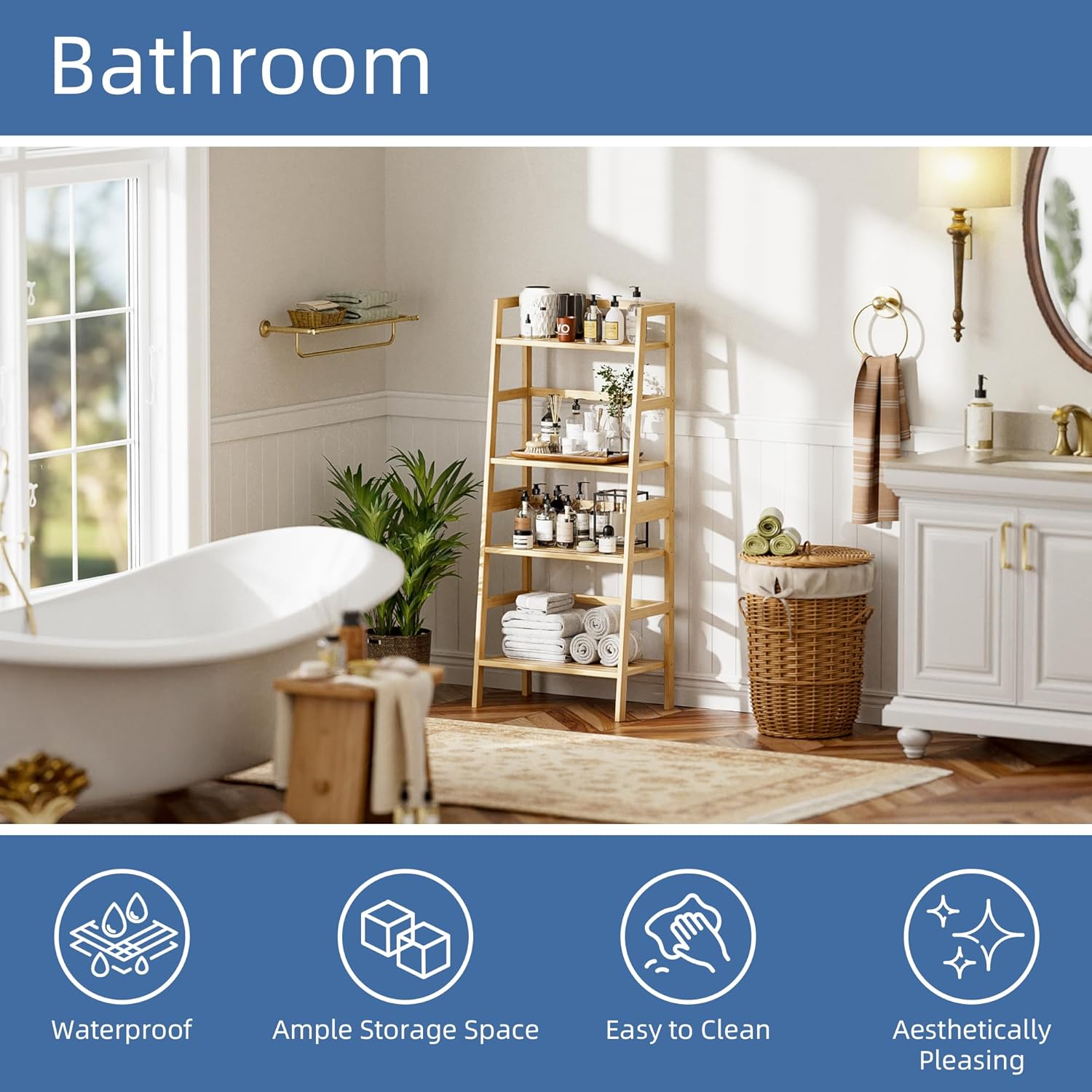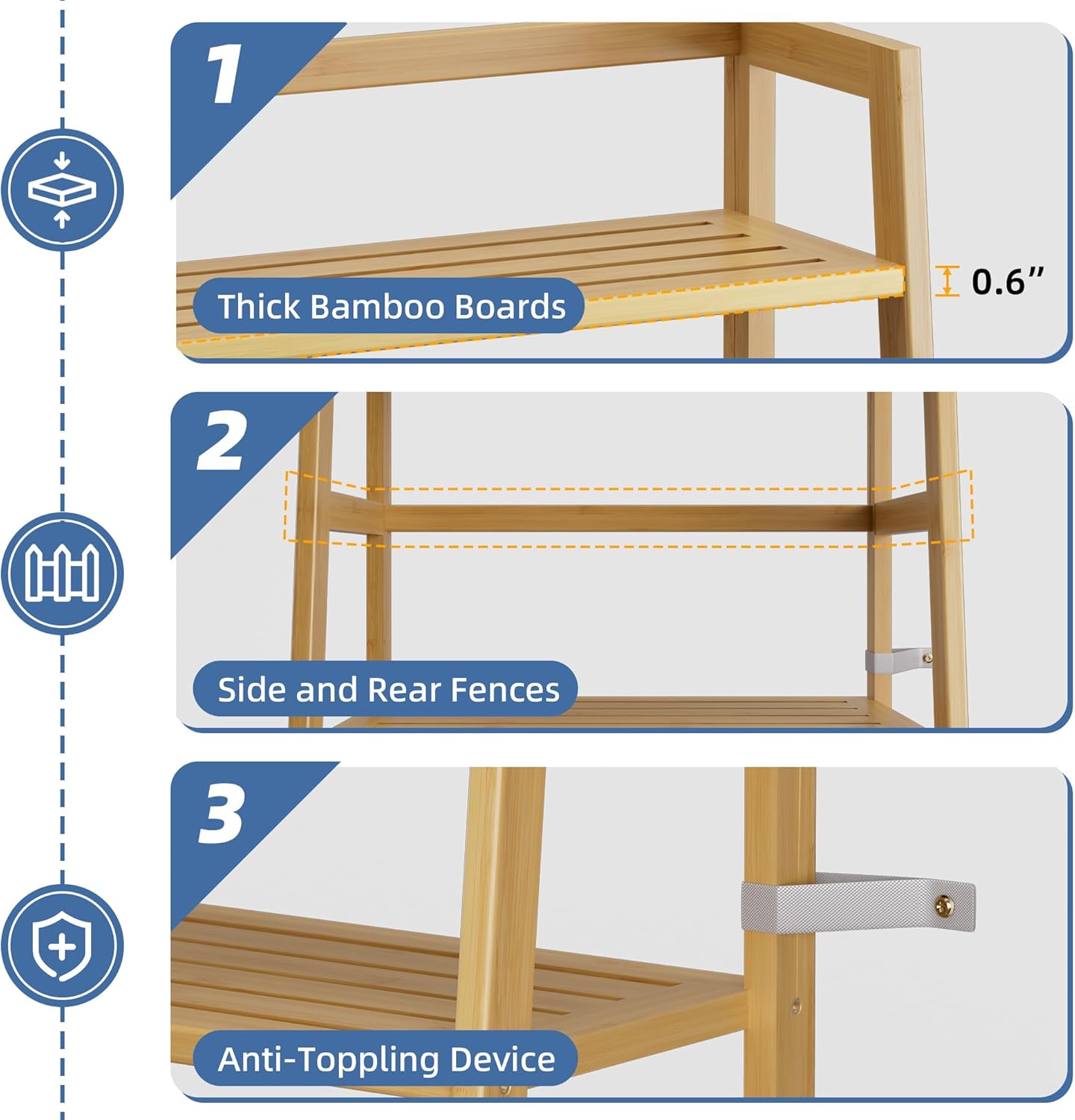 - ALL BAMBOO, STABLE AND STURDY - Crafted from select 100% all-solid bamboo wood in a sturdy trapezoidal design. Side and rear crossbars add stability and prevent books or items from falling. Reinforced crossbars underneath each shelf for added load-bearing capacity. Anti-tip kit secures the leaning shelf to the wall for safe use
