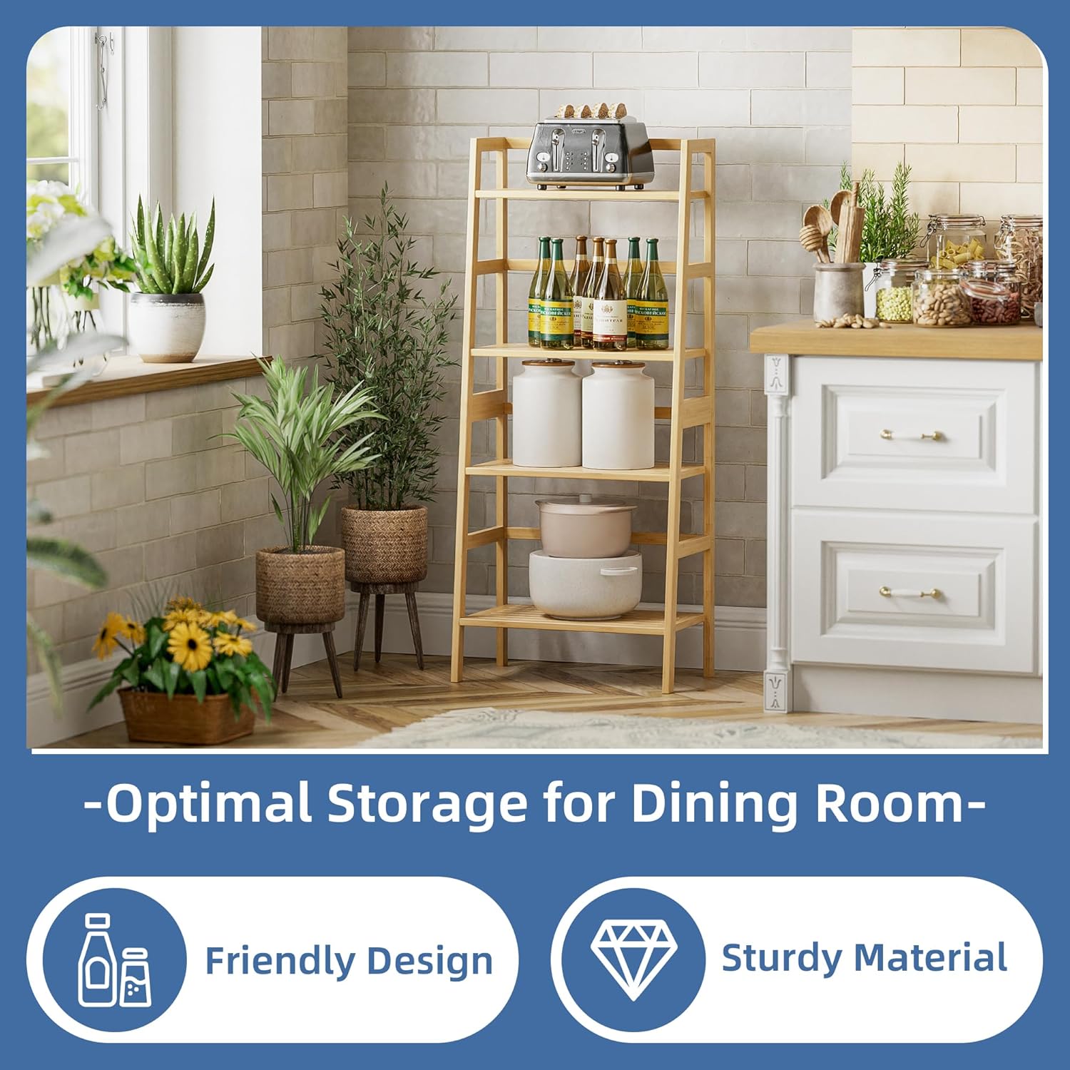 HITNET Ladder Shelf, 4-Tier Bookshelf, Bamboo Leaning Bookcase, Display Storage Rack Organizer, Freestanding Flower Plant Stand for Living Room, Home Office, Kitchen, Natural