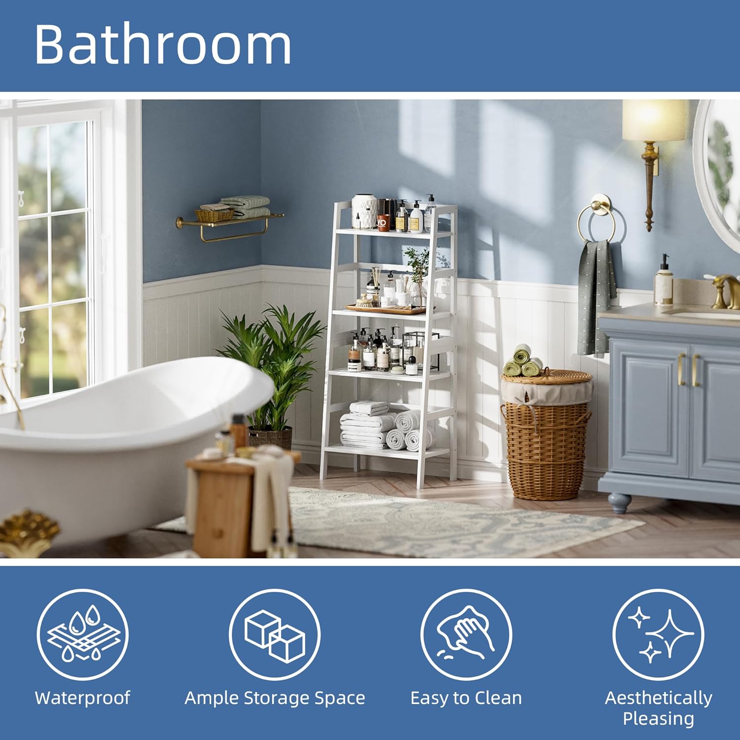 HITNET White Ladder Bookshelf, Leaning Bookcase, 4-Tier Bamboo Shelf, Floor Standing Storage Shelving Unit, Open Display Book Shelves