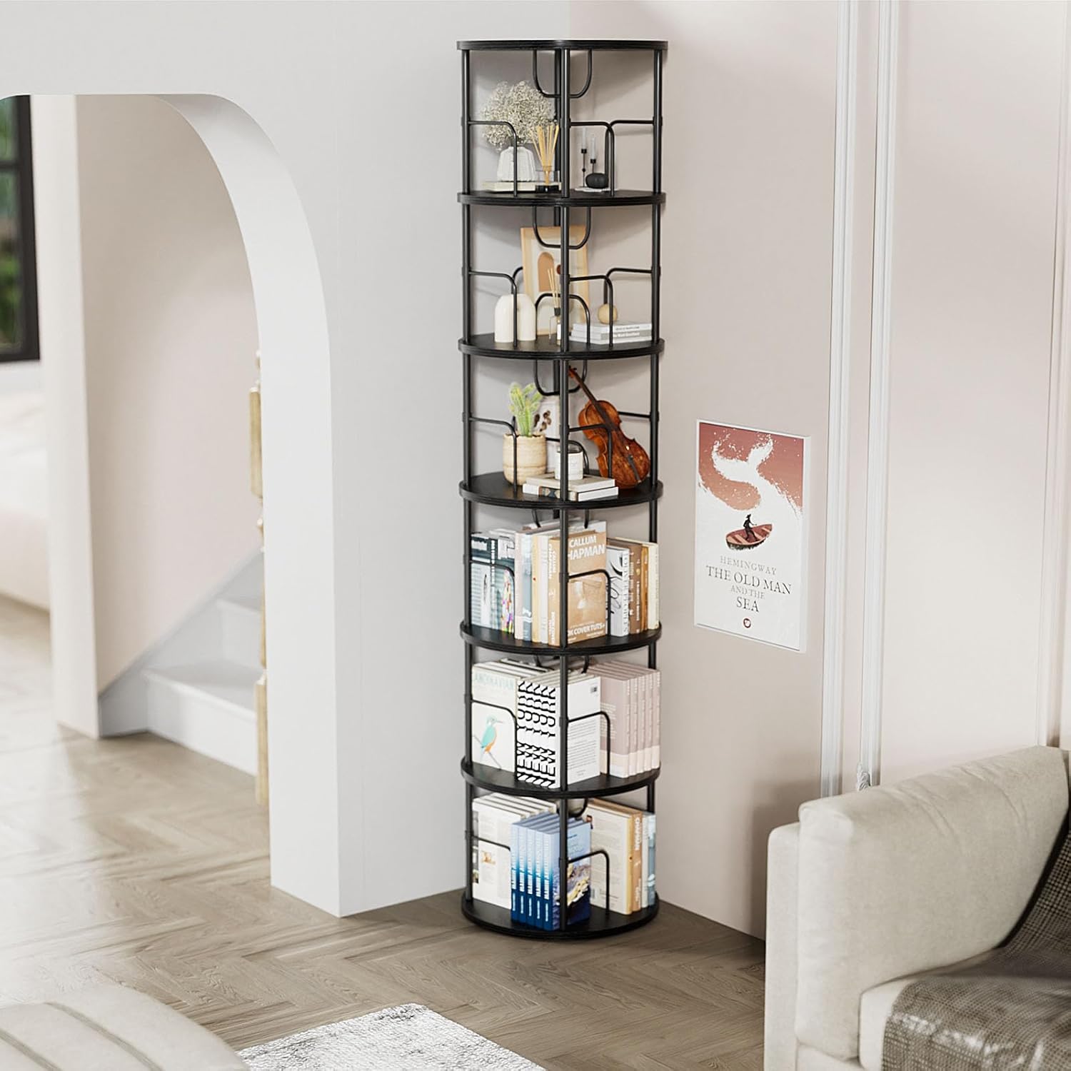 6 Tier Rotating Bookshelf, 360 ° Display Stackable Spinning Bookshelf Tower, Corner Bookshelf Tall Floor Standing Swivel Bookcase Narrow Storage Organizer for Bedroom, Living Room, Black