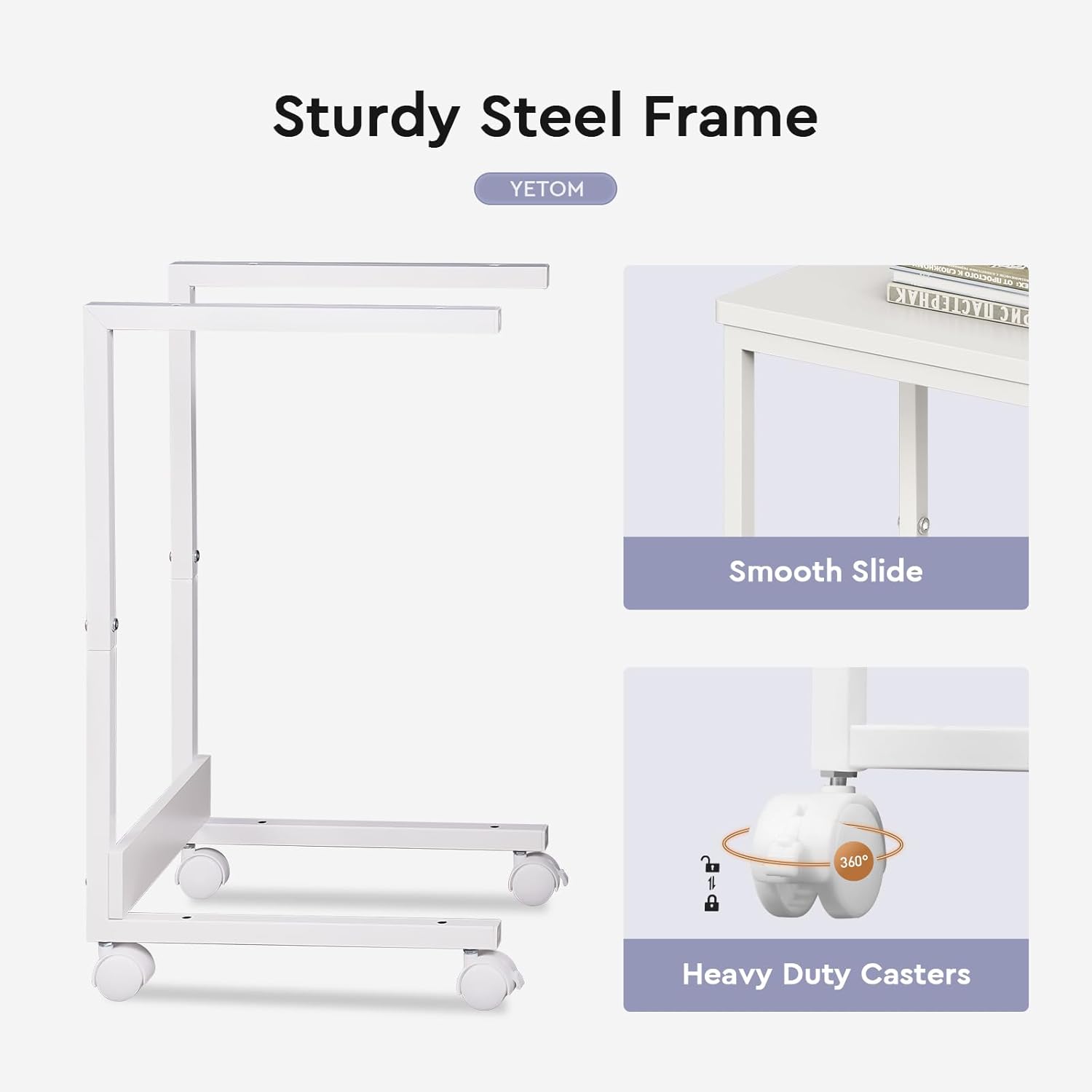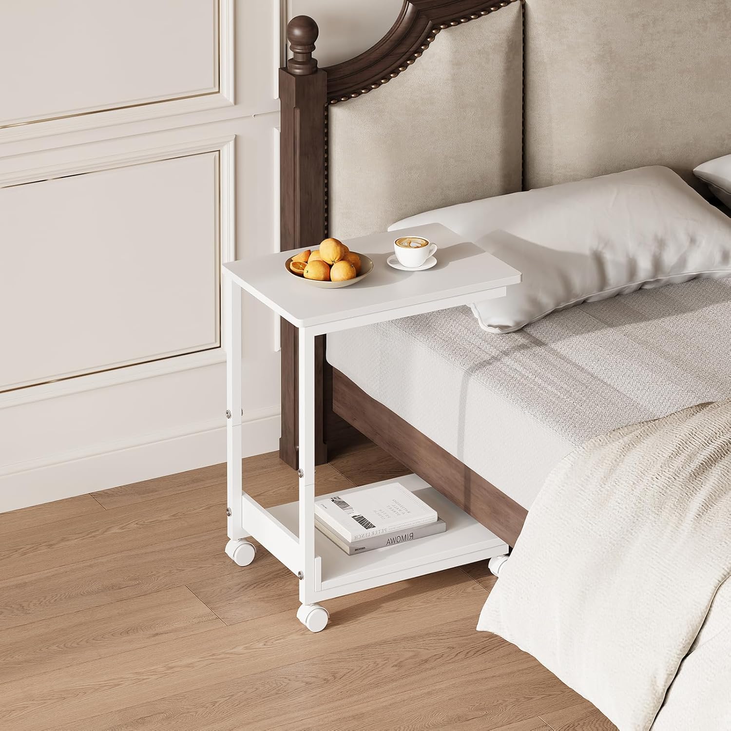 Side Table,C Table with 2-Tier Storage Shelf, End Table TV Tray with Metal Frame, Sofa Table with Wheels for Living Room, Bedroom, Office, Bathroom, Easy Assembly, White