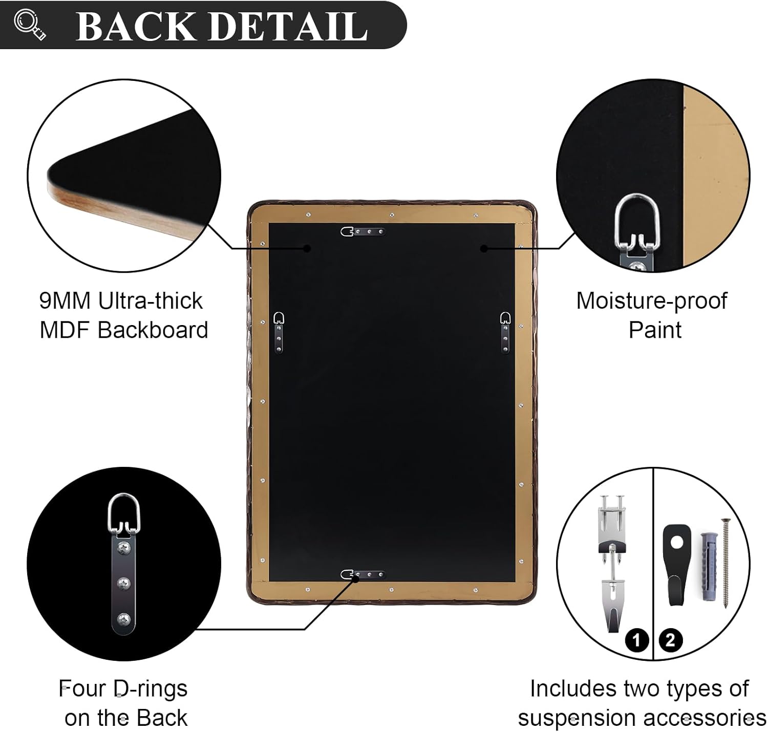 - Thoughtful Packaging & Service: Four pre-installed D-rings on the backboard and included suspension accessories allow you to hang this farmhouse mirror for bathroom vertically or horizontally. Carefully designed packaging ensures that this precious artwork is handed over to you in perfect condition. With over 20 years of experience in high-end bronze metal mirror manufacturing, Our mirror offers a one-year warranty to guarantee your peace of mind.