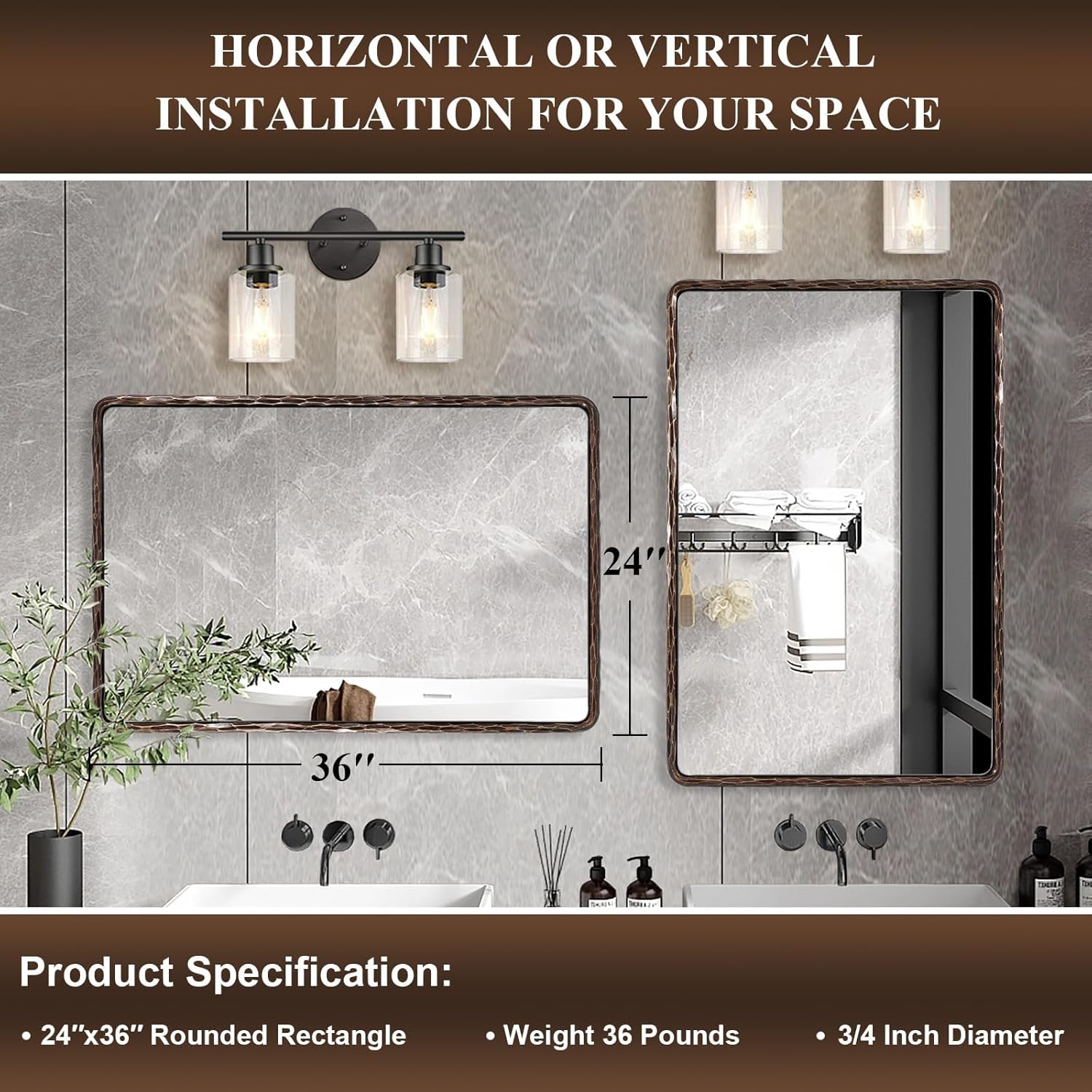 ANDY STAR Hand-Forged Bronze Bathroom Mirror for Wall, 24x36 Inch Vintage Solid Steel Metal Frame Bathroom Vanity Mirror, Antique Rounded Rectangle Wall Mirror, Hangs Horizontally or Vertically