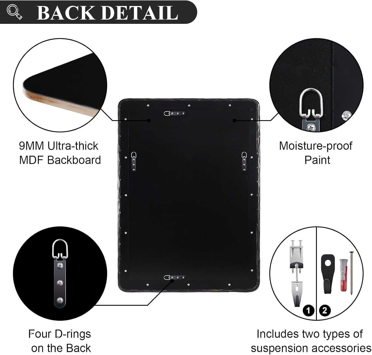 - Thoughtful Packaging & Service: Four pre-installed D-rings on the backboard and included high-strength adjustable suspension accessories allow you to hang this farmhouse bathroom mirror vertically or horizontally. Carefully designed packaging ensures that this precious artwork is handed over to you in perfect condition. With over 20 years of experience in high-end black metal mirror manufacturing, Our mirror offers a one-year warranty to guarantee your peace of mind.