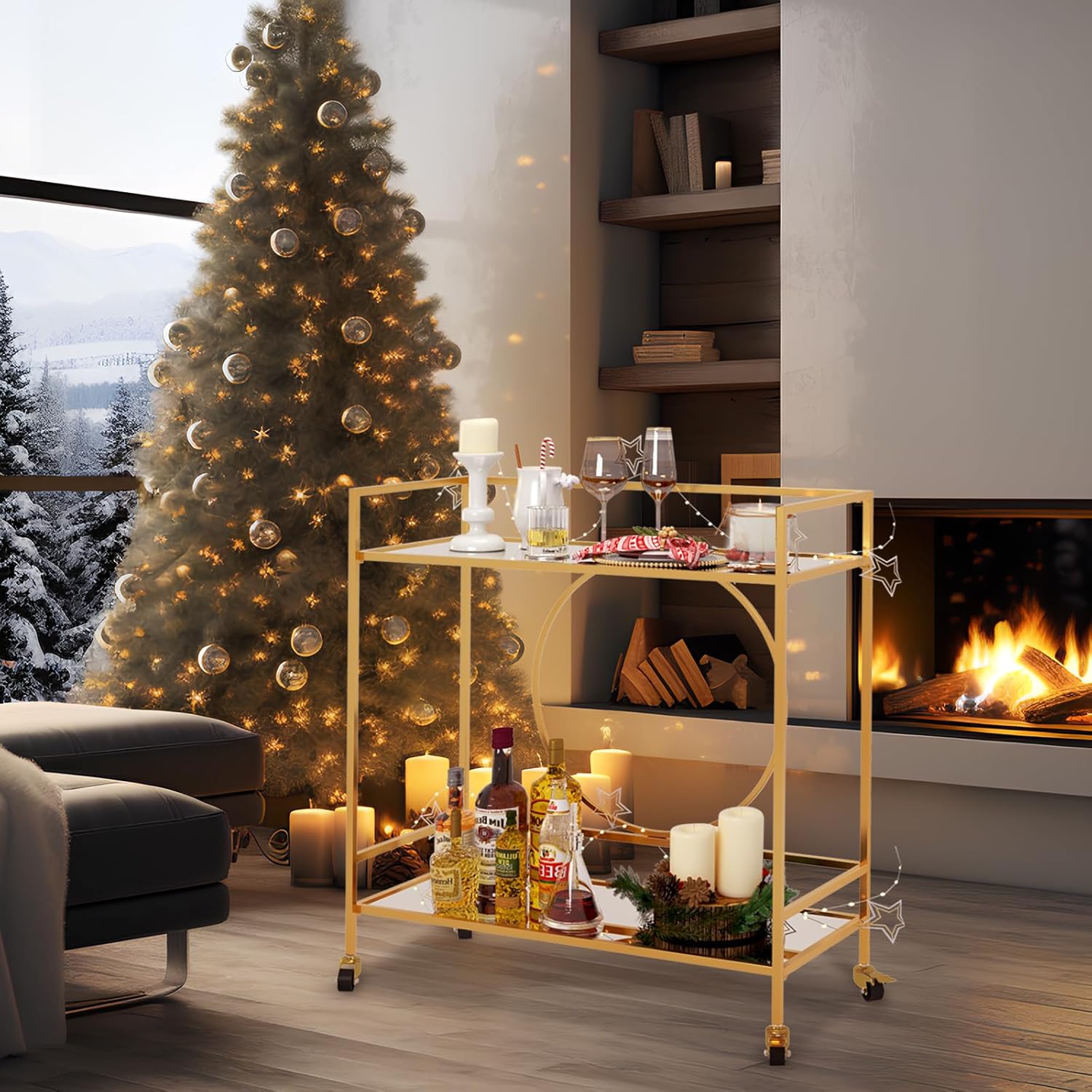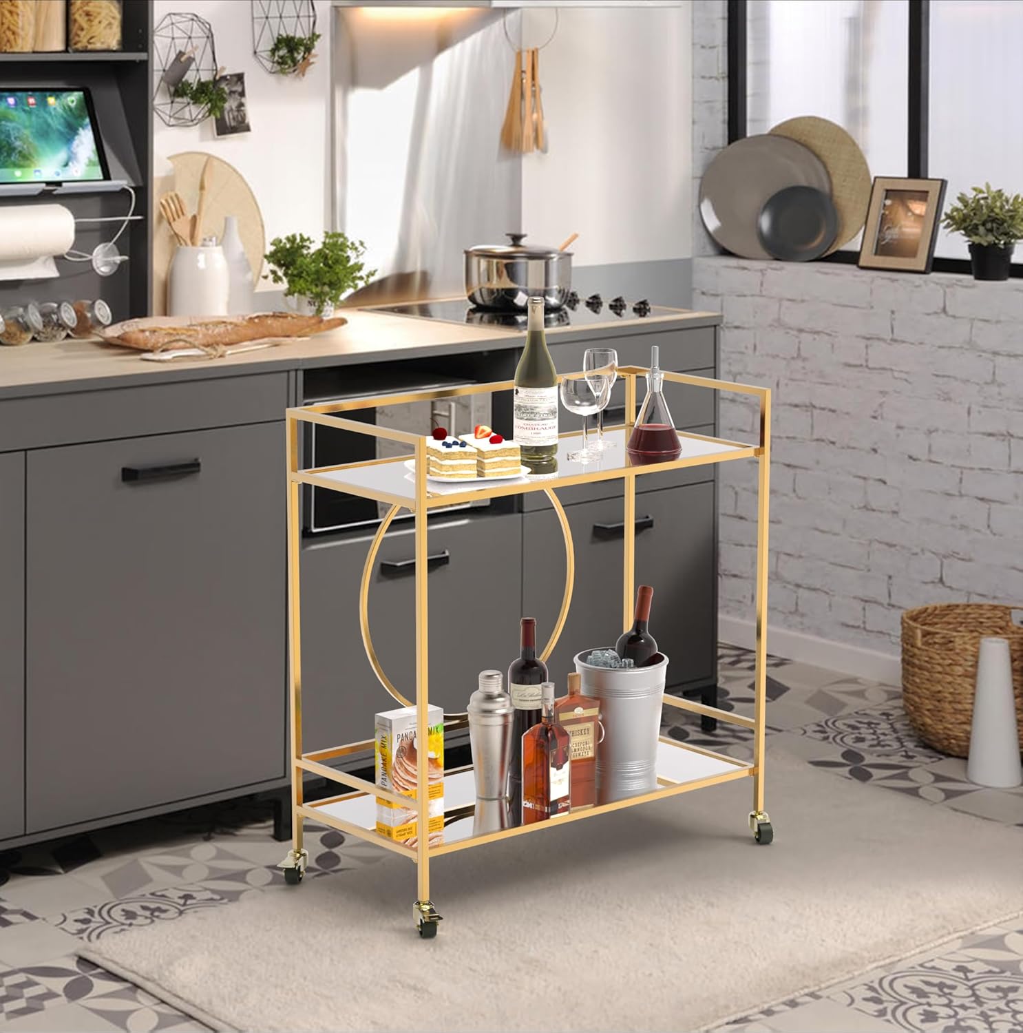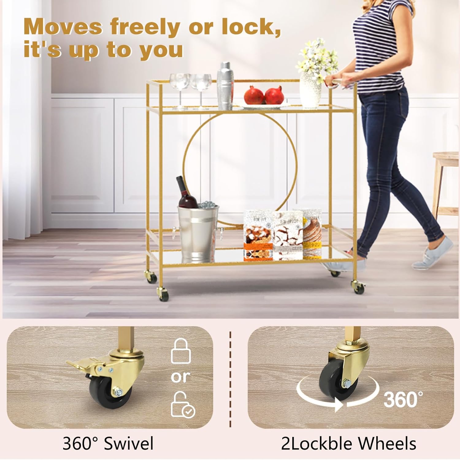 RiteSune Gold Bar Cart, Modern Wine Cart with Wheels, Home Bar Serving Carts with 2 Tier Mirrored Shelves, Wine Bar Carts for The Home, Dining Room, Kitchen