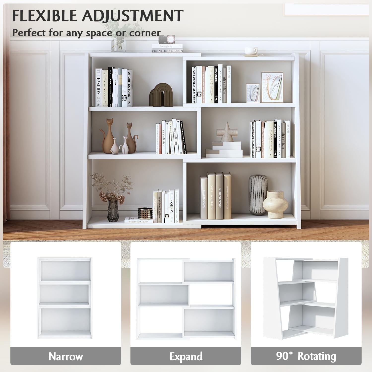 IOTXY Wooden Extendable Shelf Bookcase - 3-Tier Ladder Low Short Bookshelf for Small Space or Corner, White, S