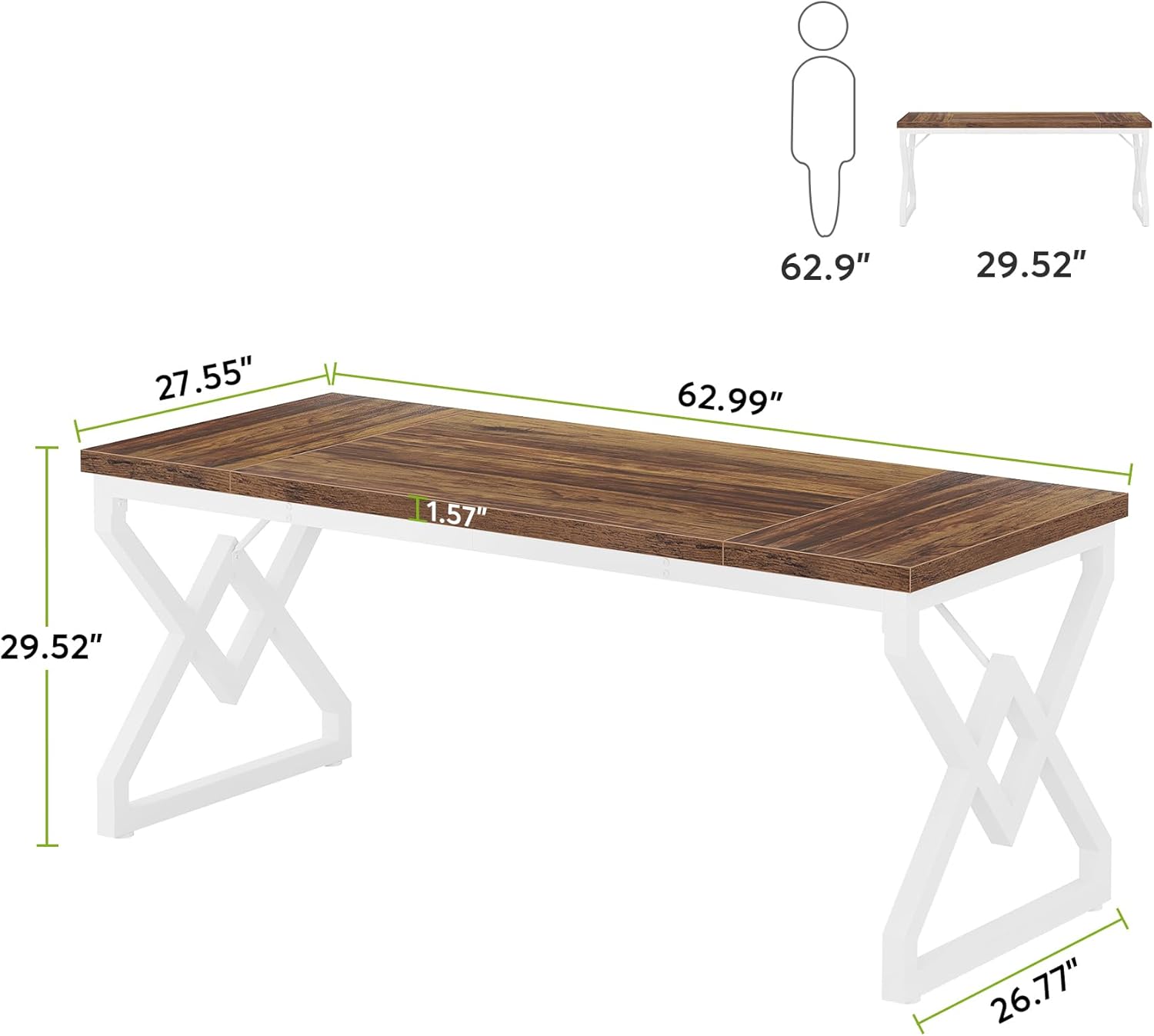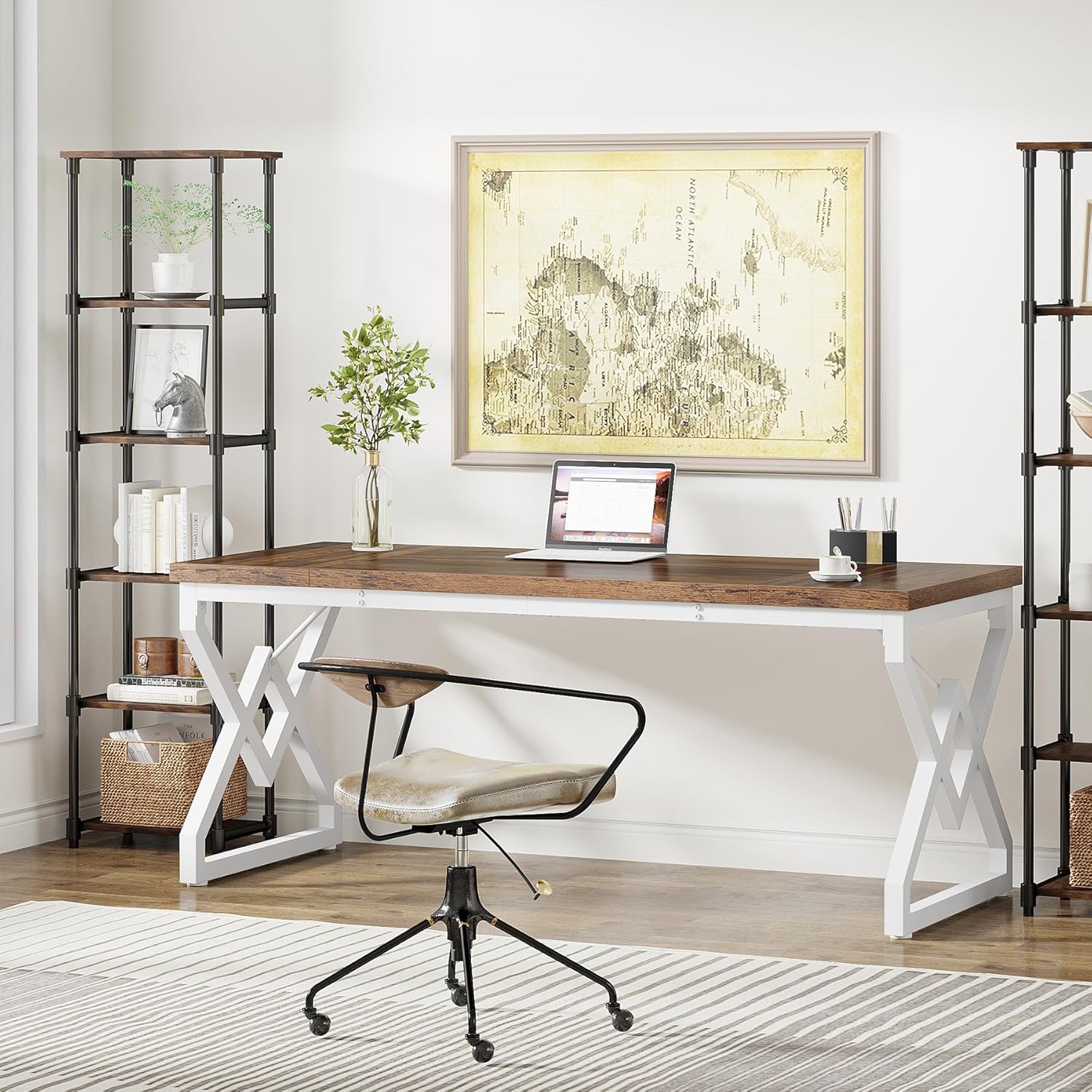 Tribesigns 63 Inch Executive Desk, Large Office Desk with Metal Frame, Ergonomic Writing Desk Computer Workstation, Modern Wood Computer Desk for Home Office, Easy Assembly (Brown+White)