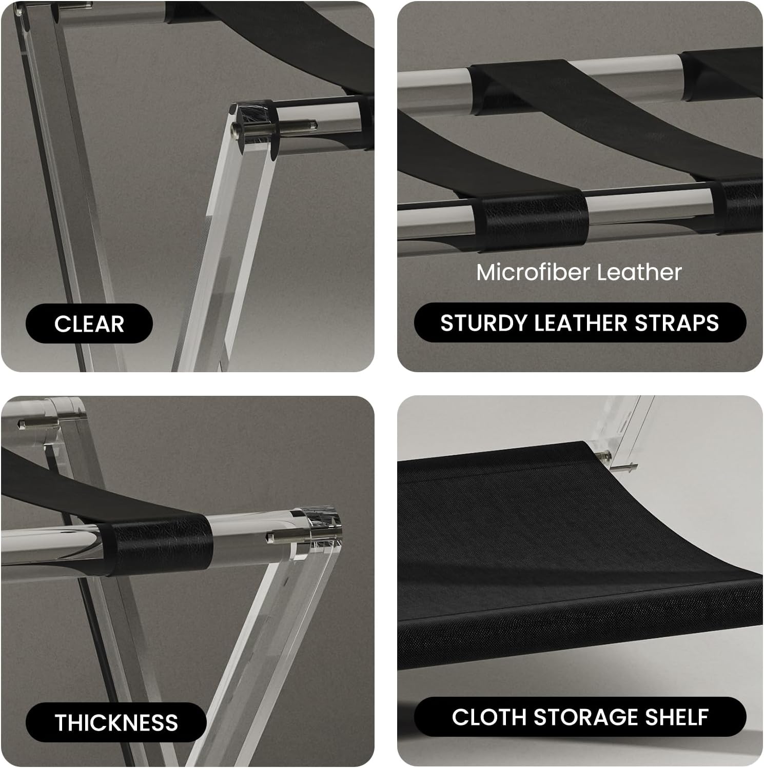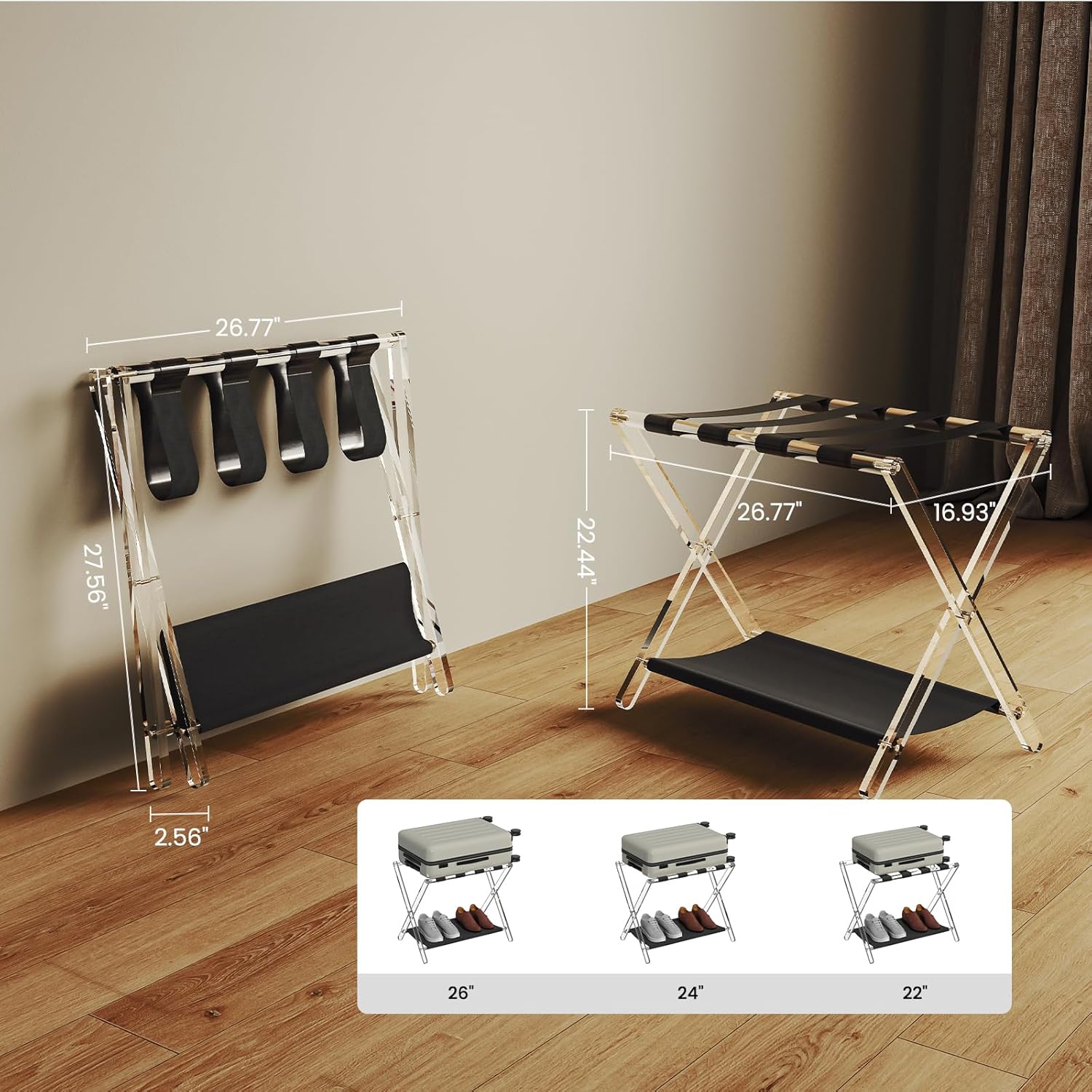 Sumerflos Acrylic Luggage Rack for Guest Room - Foldable Suitcase Stand with Leather Straps for Bedroom Living Room Hotel Heavy-Duty, Holds up to 50-100 lb lightweight Space Saving (Black & Shelf - 1 Pcs)