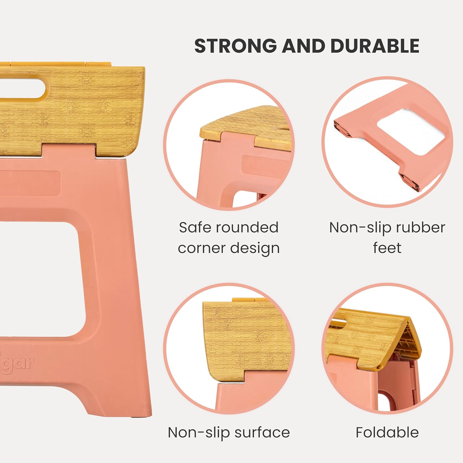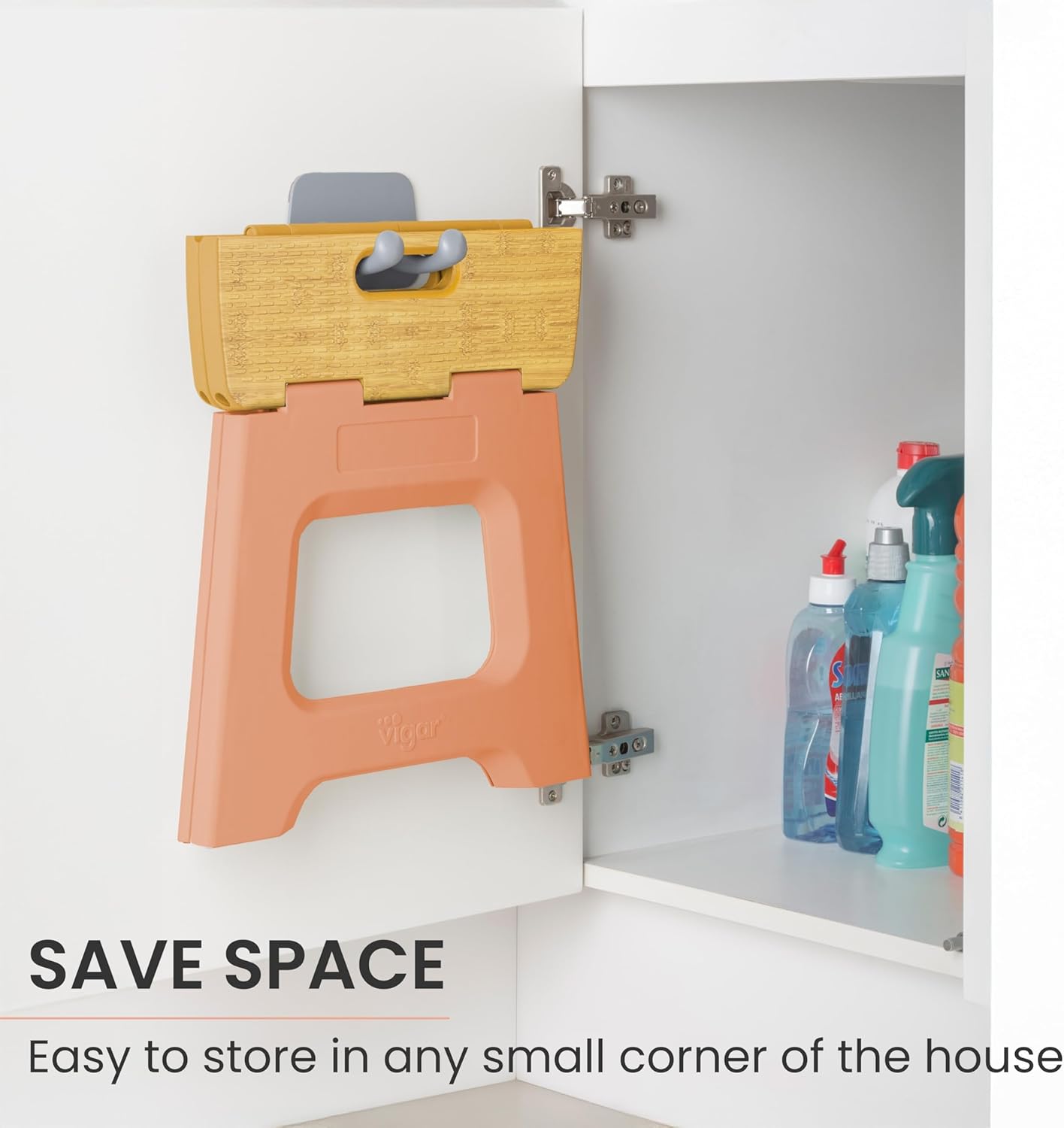 Vigar Compact Step Stool Foldable, 12-1/2-inch Step Stools for Adults up to 330 Pound, Lightweight Stool, Non-Slip Folding Step Stool, Sunrise Orange, Bamboo Print on Top