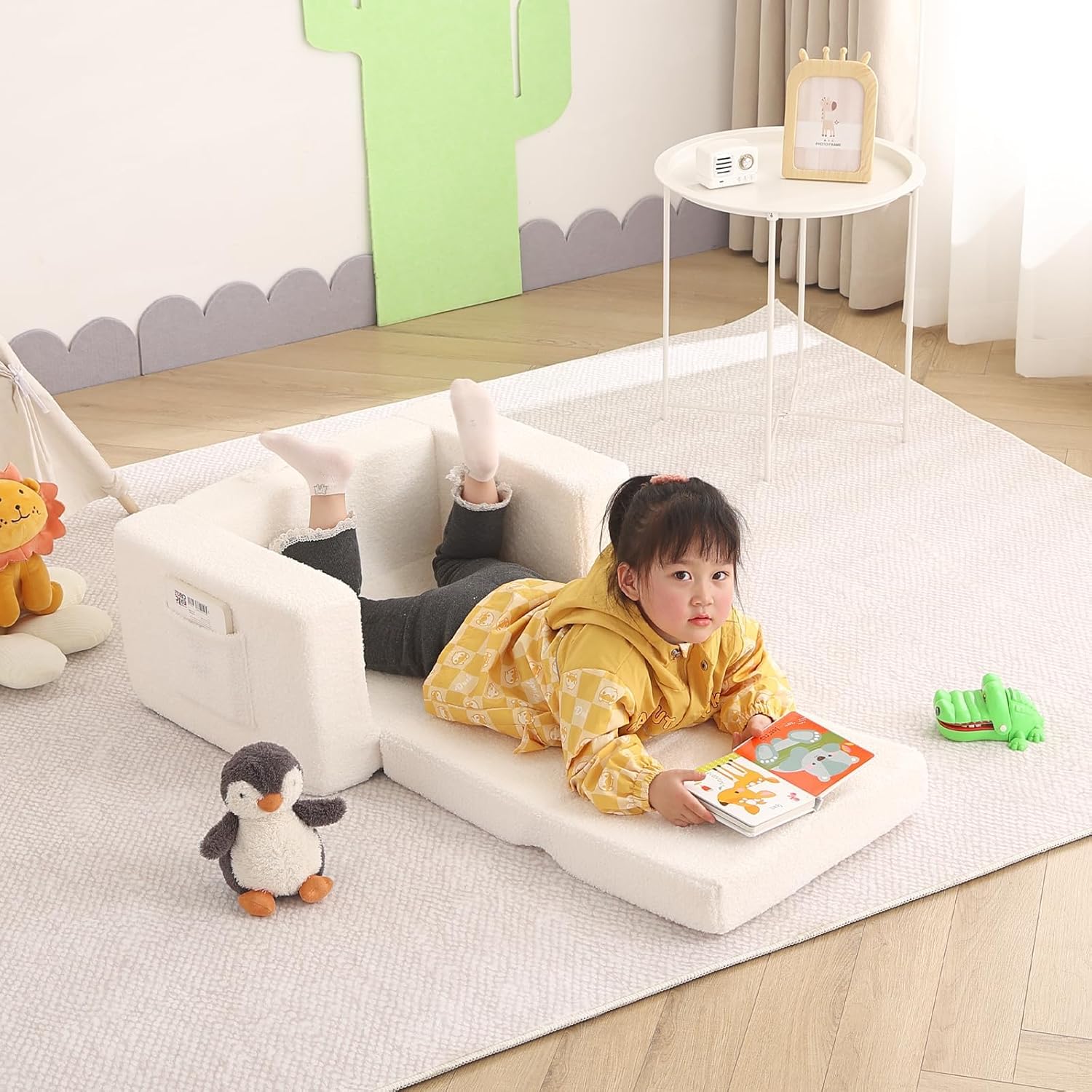 Welnow Toddler Chair, 2-in-1 Soft Sherpa Kids Sofa, Convertible Toddler Couch Lounger, Flip Out Kids Couch Chair with Side Pockets & Removable Cover for Girls and Boys, Beige