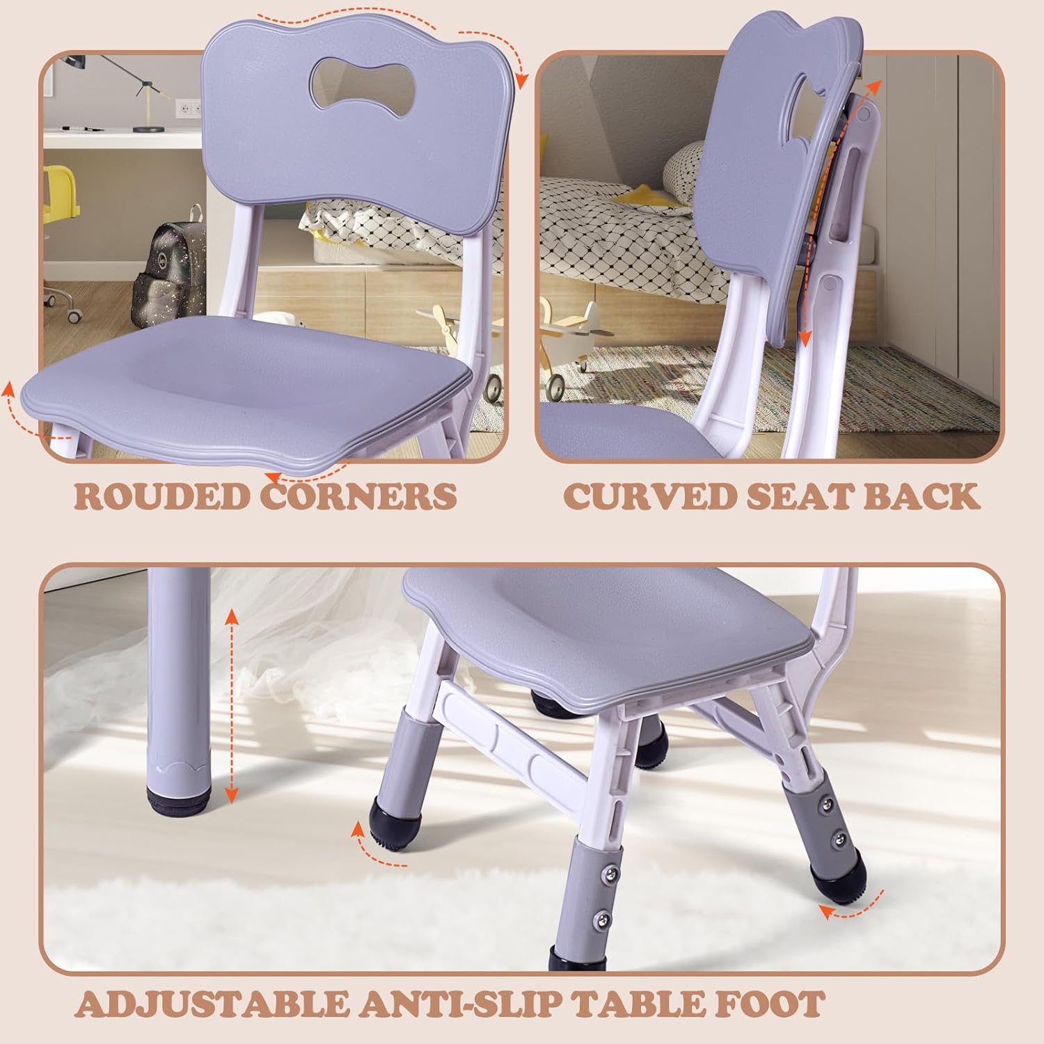 - MATERIAL SAFE & STRUCTURE STABLE --- For the sake of children's health, we strictly choose ENF grade materials, conforming to safety standards, and all materials used are healthy. The edges of the desk and chair are smooth, preventing any scratches or harm to the child. The rounded corners of the table provide better protection for the child's safety. The chairs are ergonomic, protecting the spine when the child is seated. The feet of the table and chairs are designed with anti-slip features, providing strong friction and silent movement during mobility.