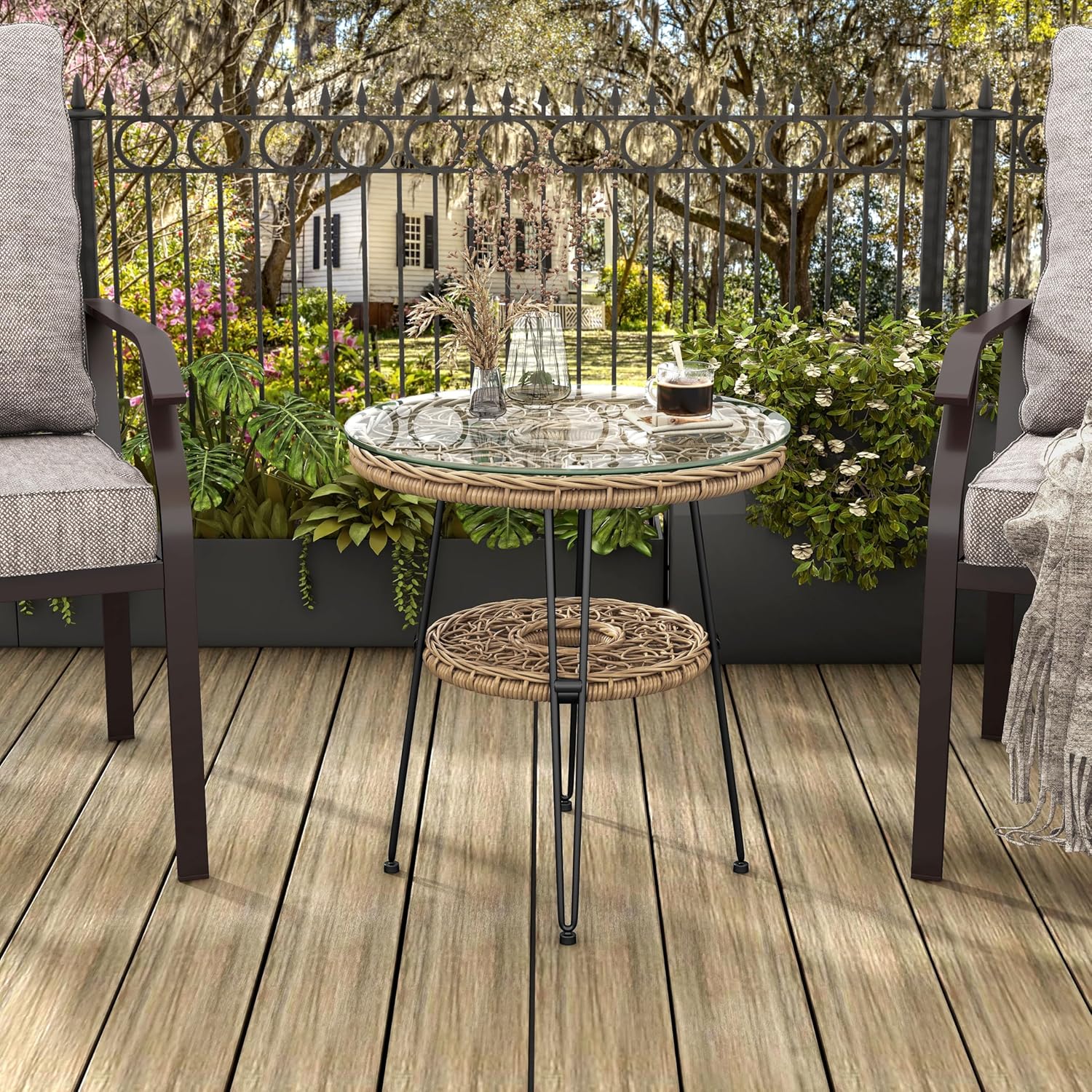 - 🌞 DURABILITY ASSURED: Crafted with UV-resistant, weatherproof PE wicker rattan and crowned with a sturdy tempered glass top, this coffee table ensures year-round outdoor elegance.