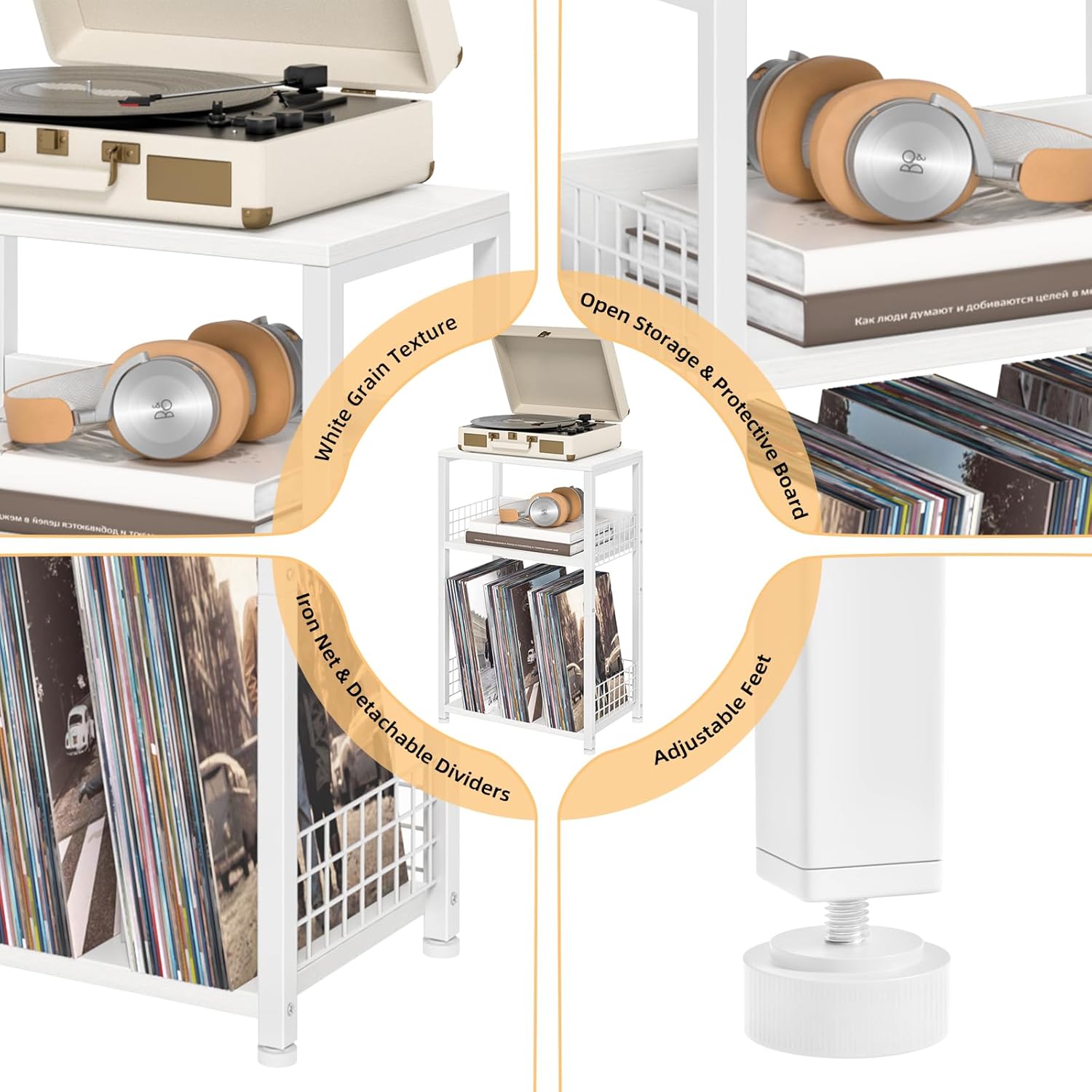 - [Thoughtful Details] The classic rectangular frame of the display storage shelf and lightweight design helps you move and carry it more easily. And we set up iron net and small wooden boards that can prevent the magazines, records and items from falling off on the 2nd and 3rd open shelves of the turntable stand . We also designed adjustable feet to help the skinny nightstand stay level on uneven floors.