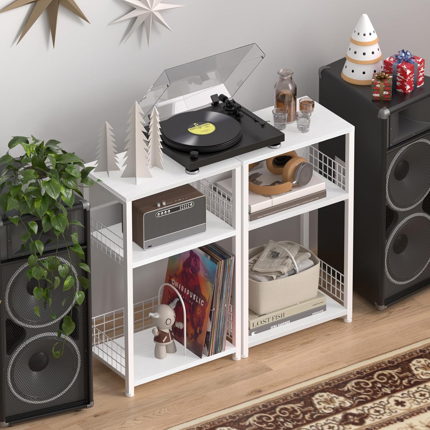 - [Record Player Stand] The white rustic record player stand has 3 tiers. The spacious tabletop is suitable for multiple sized record players. The 2nd and 3rd open storage shelves can hold all kinds of records and media essentials, storing up to 100 albums. The categorized storage of vinyl records holder combines art and practicality, filling your room with artistic atmosphere and keeping neatness.