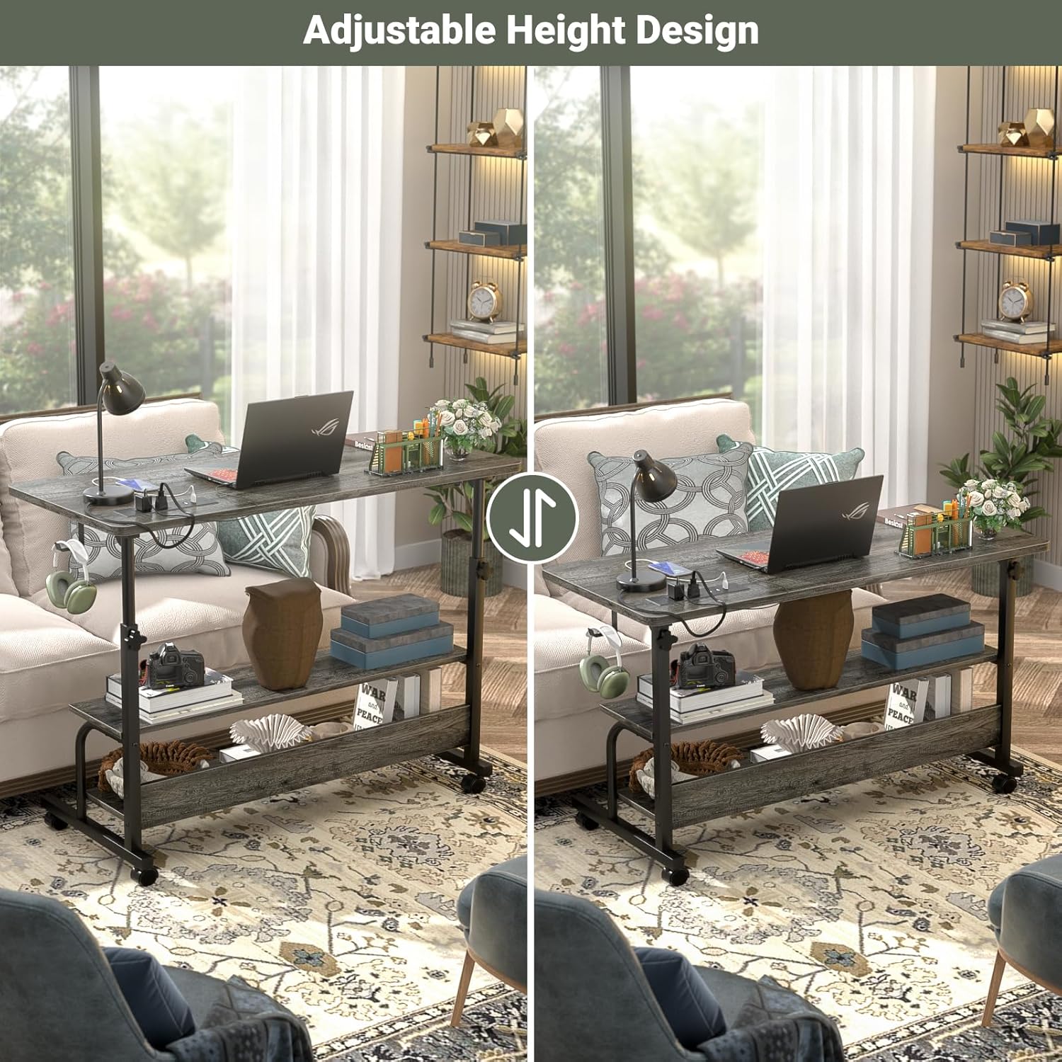 39" Height Adjustable Standing Desk with Power Outlets - Manual Rolling Stand Up Desk with Wheels Small Portable Computer Desk Mobile Laptop Table with Storage Shelves for Home Office, Grey Oak