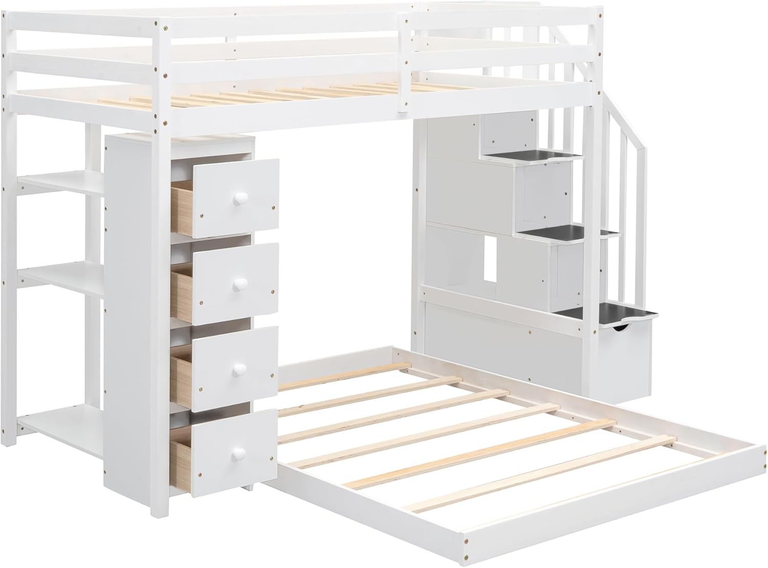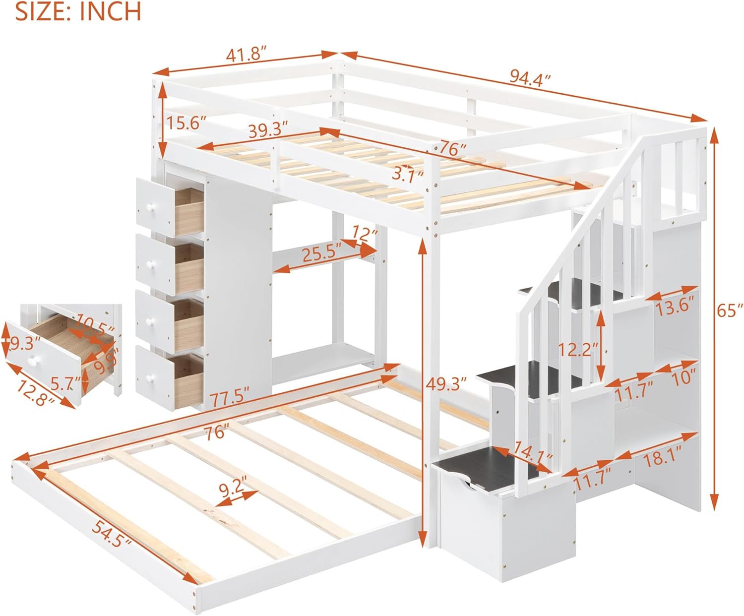 - [Versatility galore] Four big drawers underneath the bed and the lateral shelves along with the storage stairs can provide enough space to stock your clothes, books, toys or any small items you like.You can also put some decorations on it to make the bed look even better. And the bottom bed can be pulled out for independent use.
