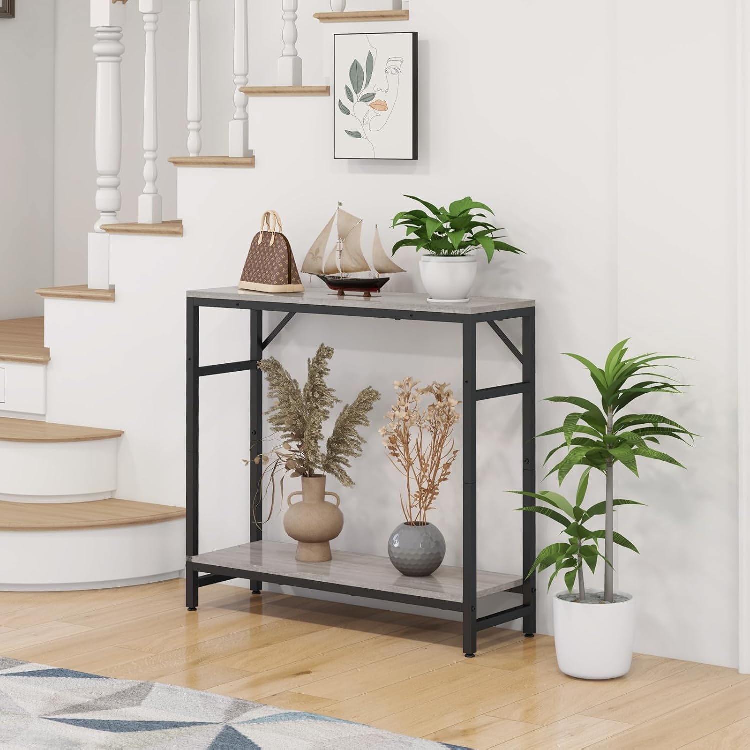 - STABLE AND STRONG: Livofloral small entryway table is made of high-quality density board and sturdy alloy frame, which ensures long time use. The additional 2 triangular support bars and 4 adjustable feet ensure that the console table can be used stably even on uneven floors.
