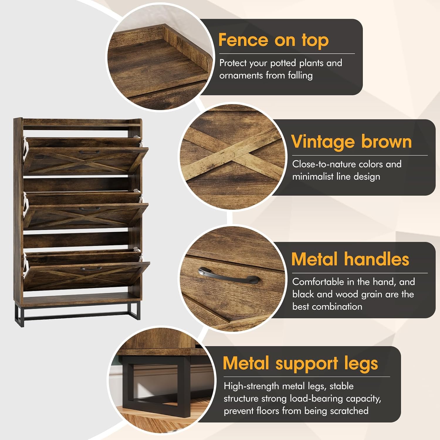 - Entryway Shoe Cabinet: The hidden shoe storage cabinet with 3 flip doors, stylish and simple rustic brown makes it a neat and beautiful finish and looks great in many different home styles. Perfect for placing in the entryway, hallway, living room, or porch, provides a neat looking in your home and space saving