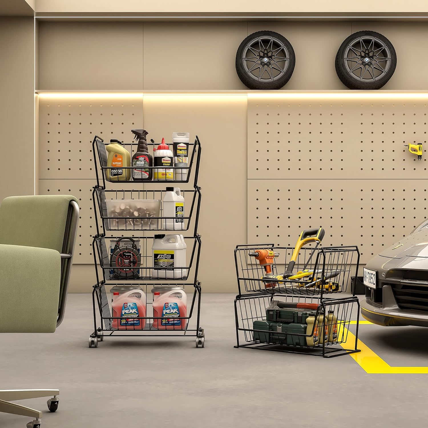 - 【Suitable Capacity】Each individual basket size: L17''x W11.5''x H8'', 6 tiers storage rack set (wheels included) size: L17''x W11.5''x H47.6''. Enough space with open design, this metal storage basket rack allows for visible storaging, convenient for sorting, you can put in or find out your item very easy in the basket. A perfect storage/space save solution for your home, kitchen, pantry closet, bedroom, bathroom, office, laundry rooms, craft rooms, playrooms garage and so on;