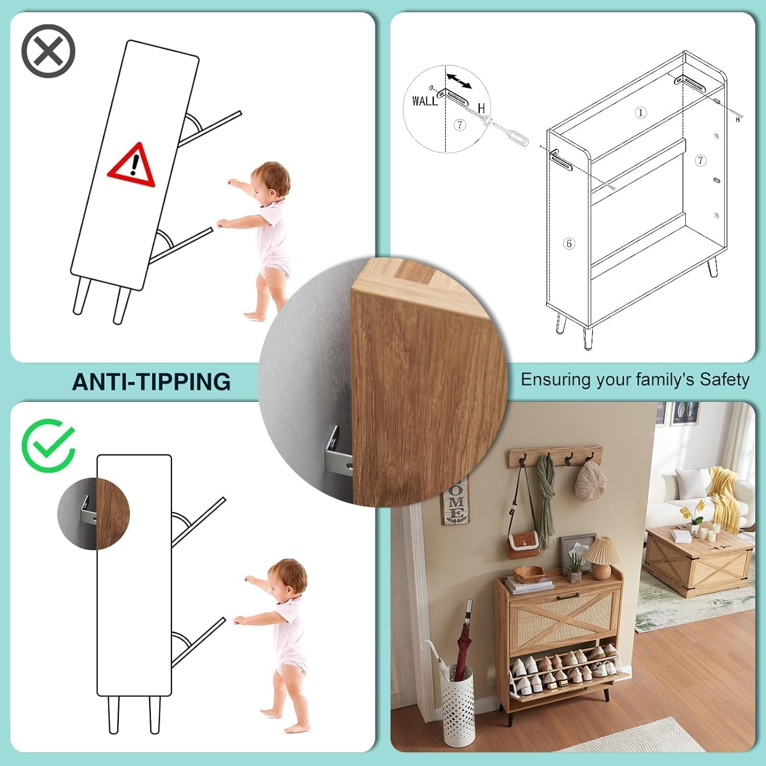- 【Stable Structure】9.4 inches in depth. The shoe cabinet is thin enough to fit even in a narrow hallway.The anti-tipping kits can prevent injuries from furniture tip-over, this item should be securely fixed to the wall