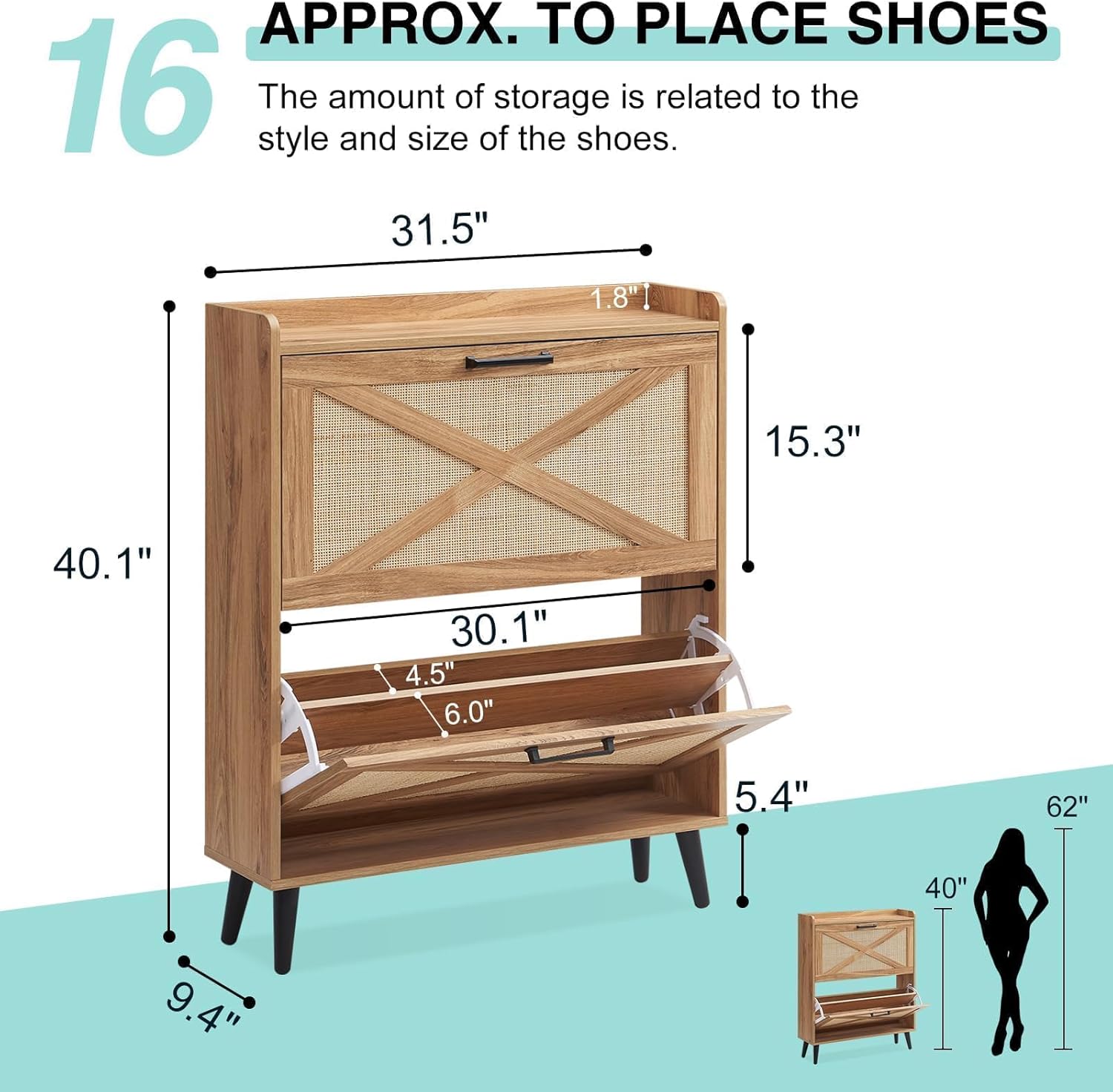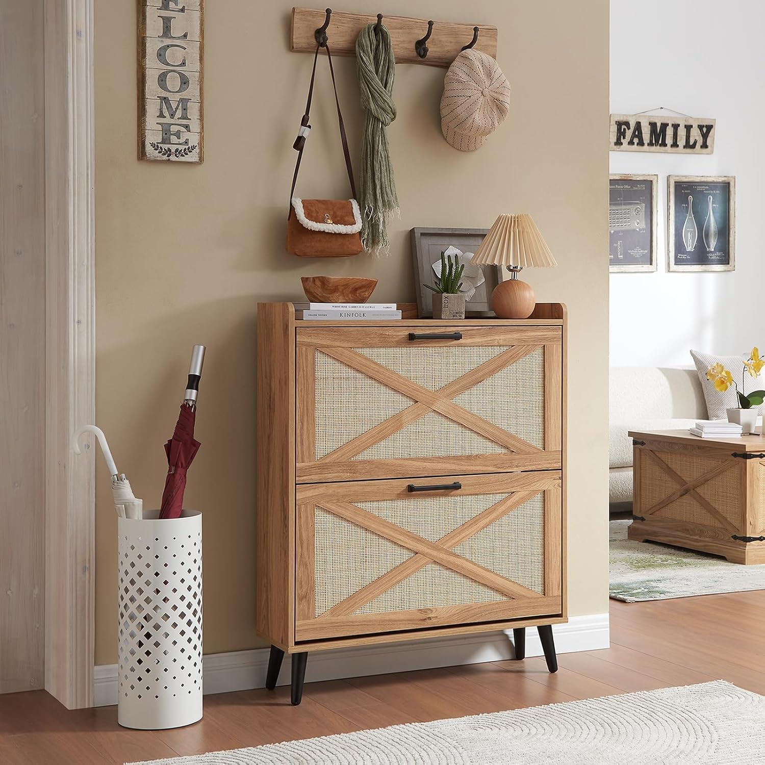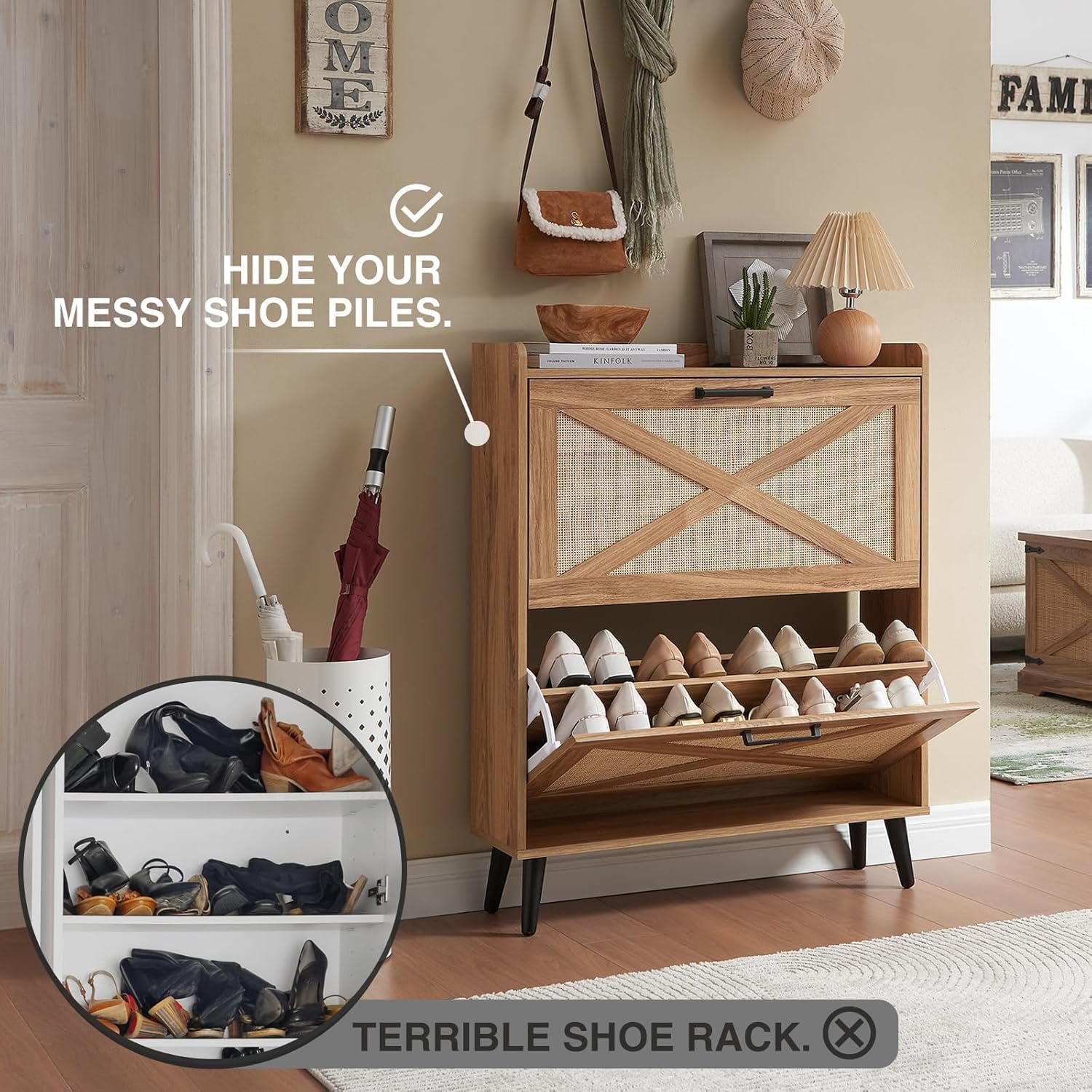 Shoe Storage Cabinet, Boho Shoe Organizer with 2 Flip Drawers & Rattan Design,Farmhouse Freestanding Hidden Slim Narrow Shoe Rack Cabinet for Entryway, Foyer,Hallway, Natural