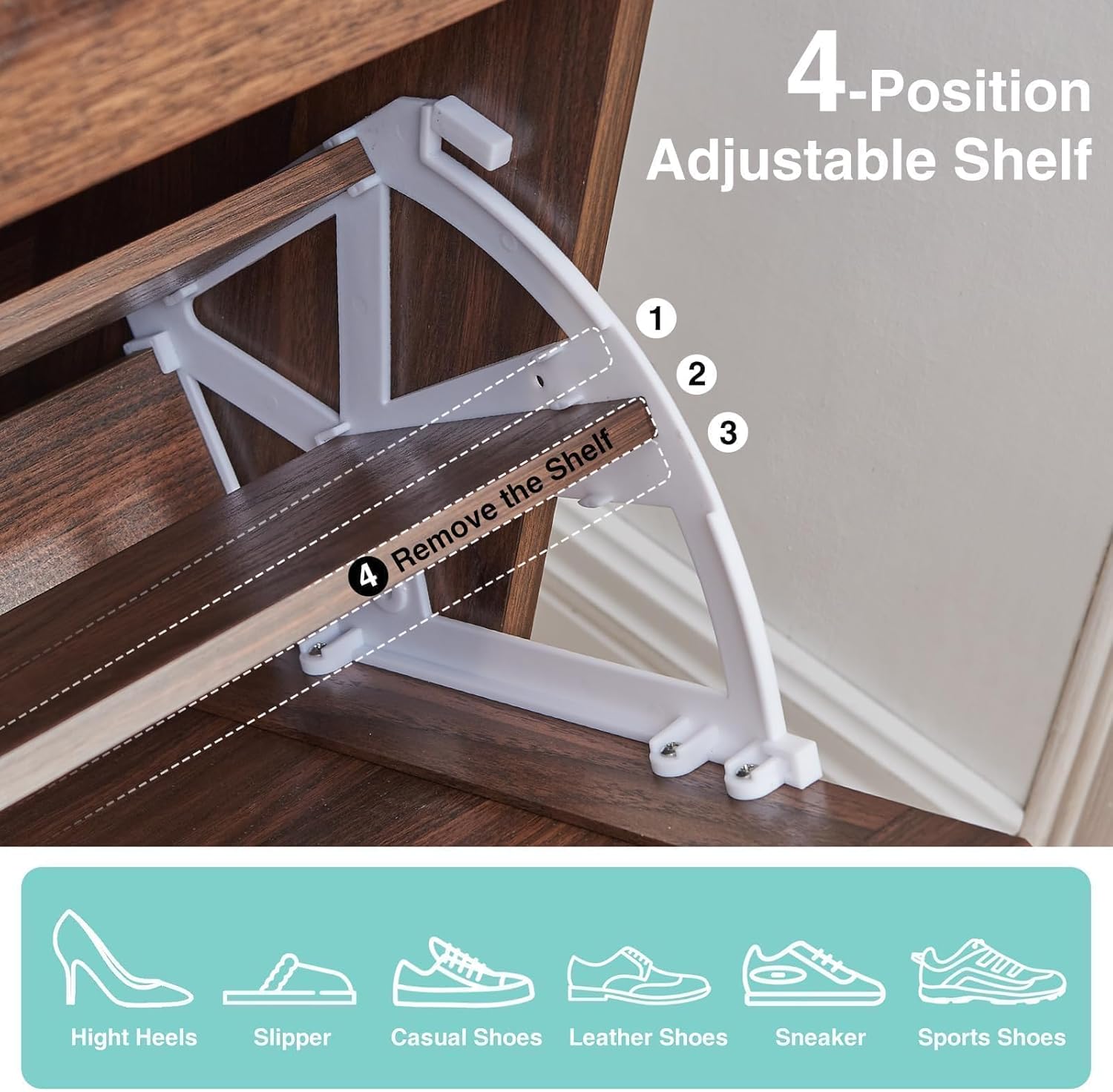 - 【Farewell to Shoe Piles】Keeps shoes handy but out of sight. Your guests will never guess that you have 16 pairs of shoes stored in this shoe cabinet it is that smart-looking. Two flip drawers and each with two layers. Need storage for ankle boots and high heels? You can easily adjust the space in the shoe compartments by moving or taking away the dividers