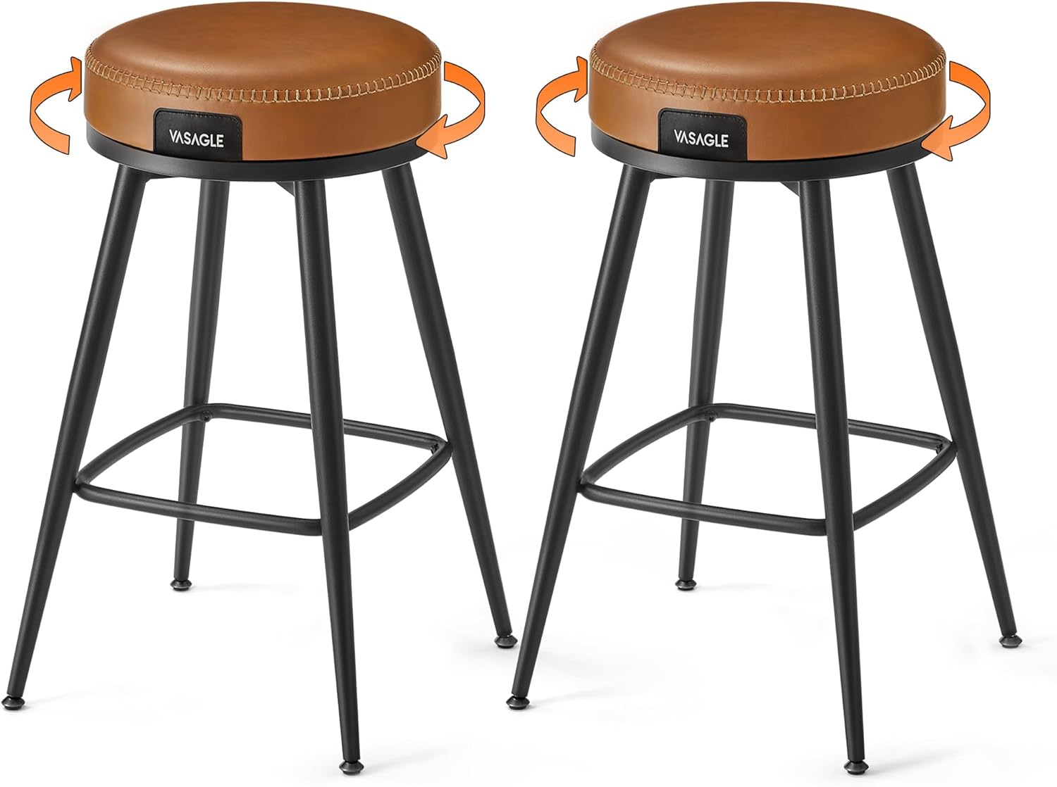VASAGLE EKHO Collection - Swivel Bar Stools Set of 2, Counter Height Backless Bar Stools, Synthetic Leather with Stitching, Mid-Century Modern, 25.6-Inch Tall Kitchen Barstools for Home, Caramel Brown