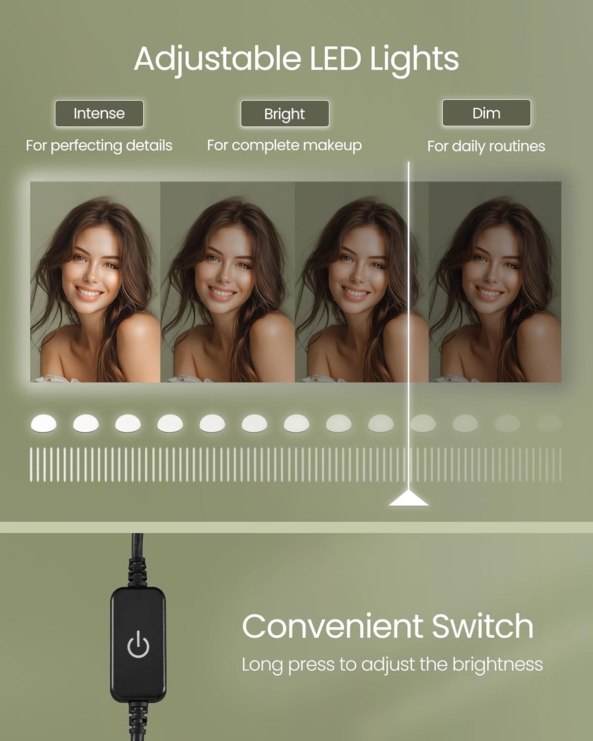- 【VANITY MIRROR WITH LIGHTS】Enhance your beauty routine with the vanity mirror of this makeup vanity surrounded by 9 adjustable light bulbs. Customize the brightness to suit your needs and achieve flawless makeup application every time